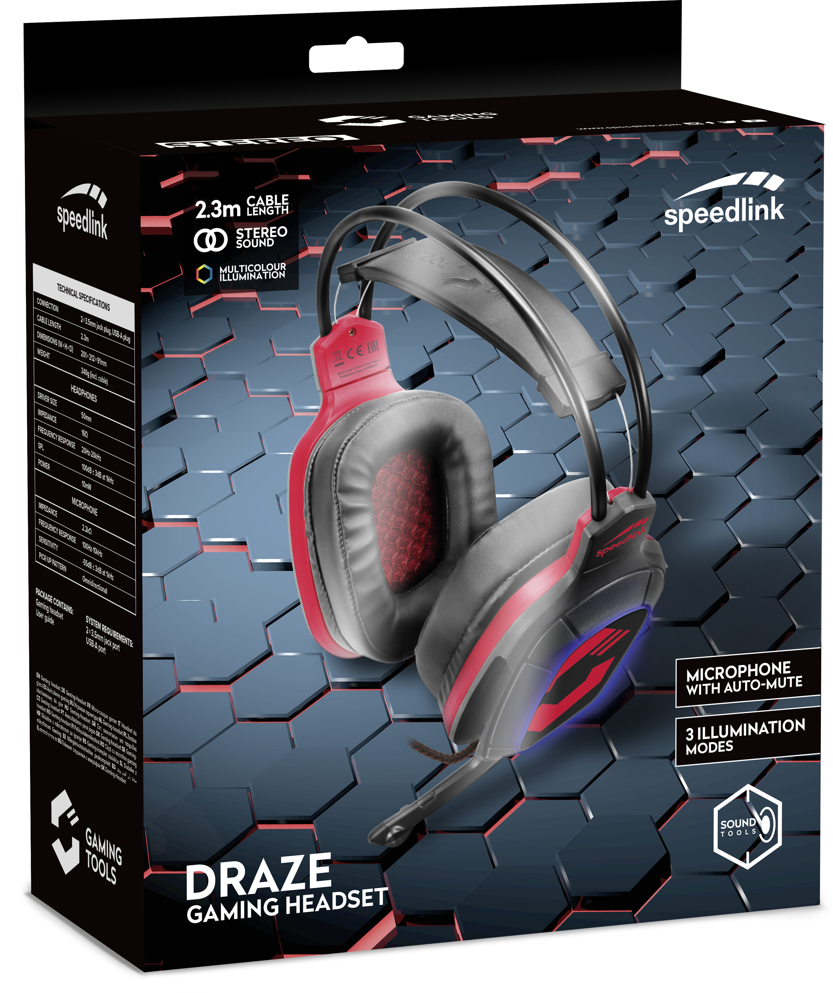 Das Design des DRAZE Gaming Headsets für den PC ist markant und mächtig, sein Sound klar und voluminös. Und seine Features vielseitig. Während deiner Gaming-Sessions profitierst du von ultra-weich gepolsterten Over-Ear-Ohrmuscheln, einem flexiblen Kopfbügel, der sich der Kopfform anpasst und von einem cleveren Mikrofonarm, der sich einklappen und dabei perfekt in der Ohrmuschel verstecken lässt, sodass dein Headset plötzlich aussieht wie normale Kopfhörer. Noch dazu aktiviert das Einklappen die automatische Stummschaltung des Mikros. Natürlich geht das aber auch über die praktische Kabelfernbedienung; hier regulierst du zudem die Lautstärke und vor allem die kraftvolle Beleuchtung des DRAZE in drei wählbaren Farben.