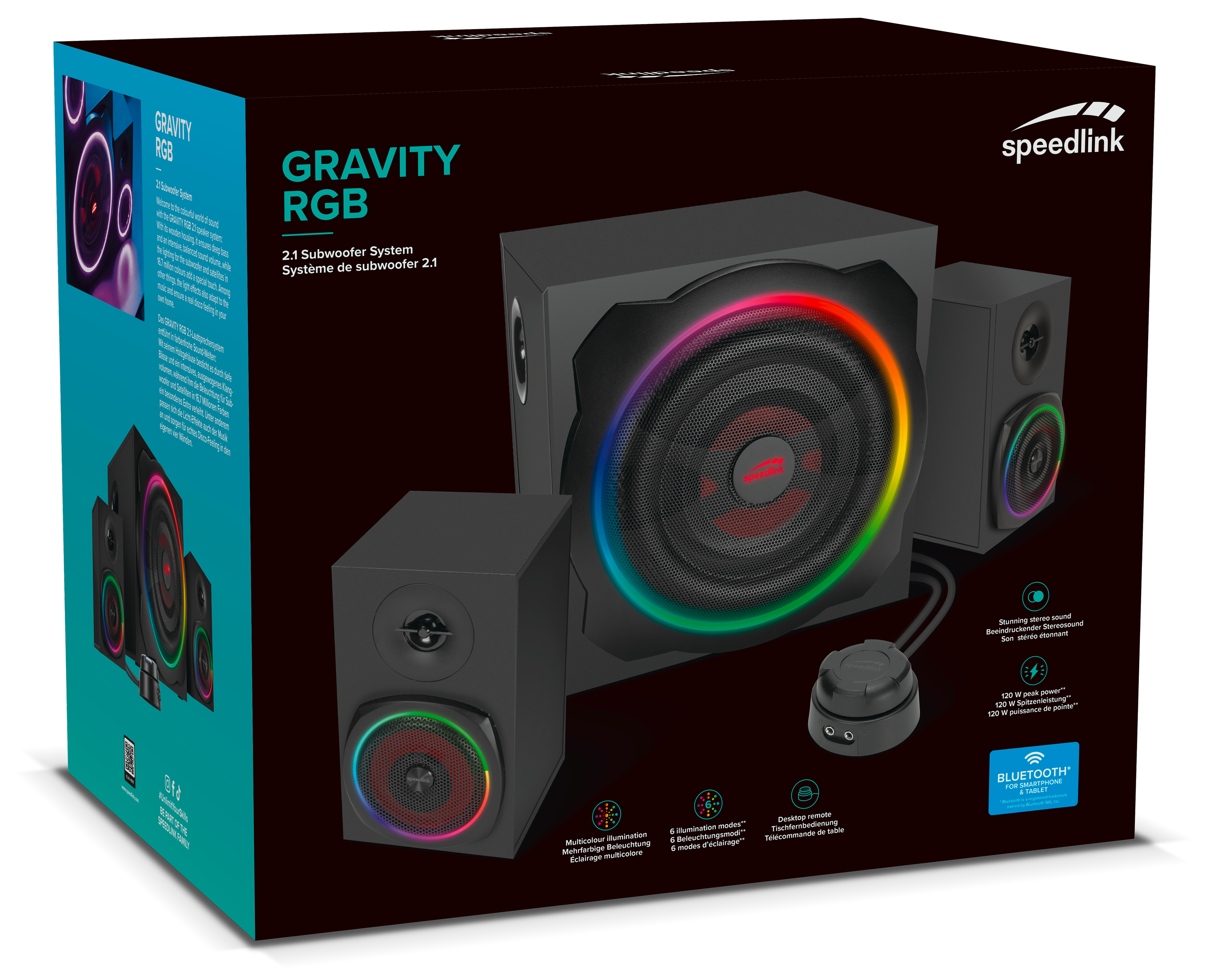 Das GRAVITY RGB ist ein aktives 2.1-Lautsprechersystem für PC und Notebook und entführt in farbenfrohe Sound-Welten: Mit seinem Holzgehäuse besticht es durch tiefe Bässe und ein intensives, ausgewogenes Klangvolumen, während ihm die Beleuchtung für Subwoofer und Satelliten in 16,7 Millionen Farben ein besonderes Extra verleiht. Unter anderem passen sich die Licht-Effekte auch der Musik an und sorgen für echtes Disco-Feeling in den eigenen vier Wänden. Du kannst das GRAVITY RGB sowohl über ein AUX-Kabel als auch über Bluetooth® mit einem Multimedia-Gerät, Smartphone oder Tablet verbinden und profitierst so von vielseitigen Einsatzmöglichkeiten. Das Lautsprechersystem lässt sich bequem über eine praktische Tischfernbedienung steuern und dank Netzschalter und automatischem Standby-Modus wird unnötigem Stromverbrauch vorgebeugt.