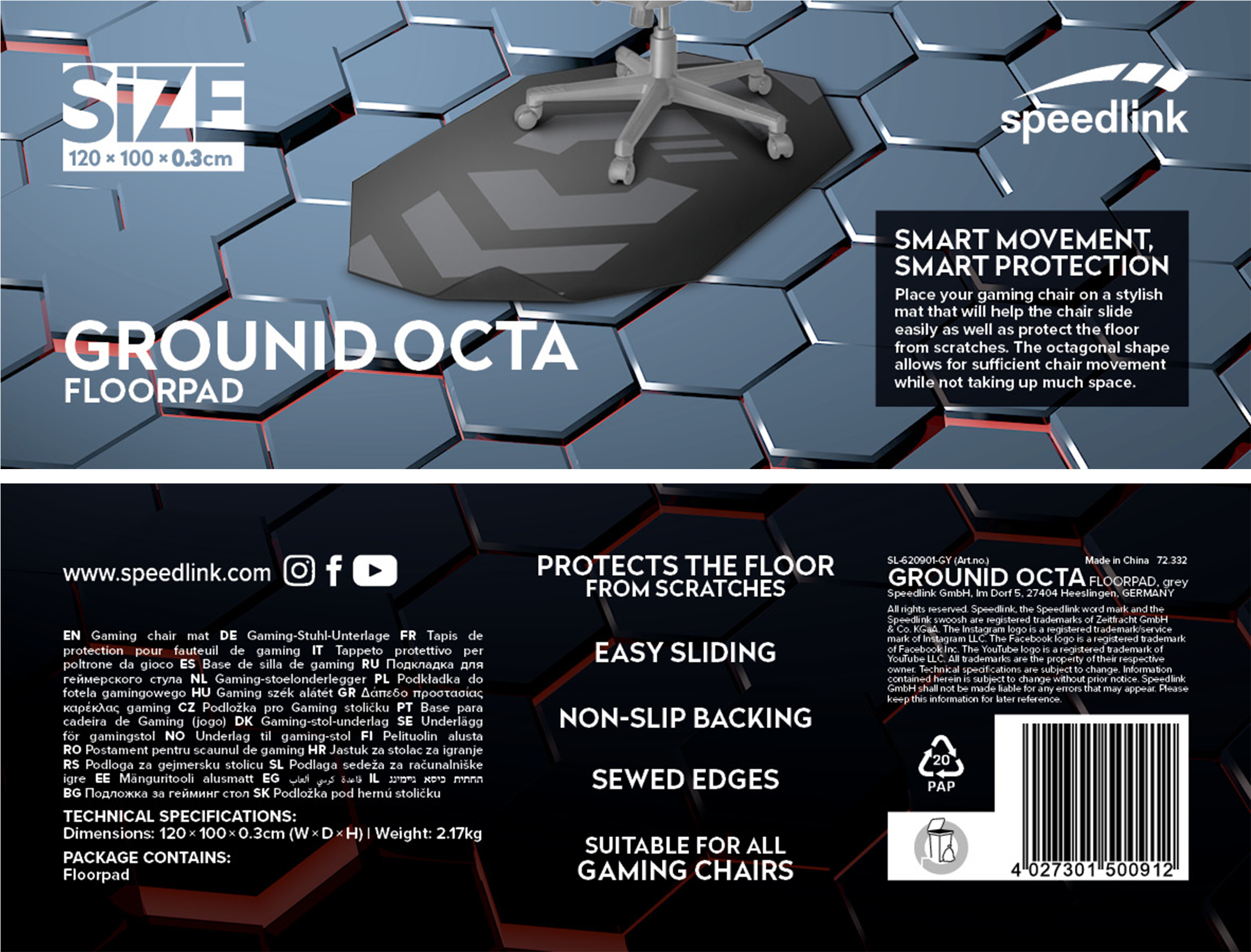 Smarte Bewegung, smarter Schutz: Das GROUNID OCTA ist deine perfekte Grundlage für ausgedehnte Gaming-Sessions. Auf der stylischen Unterlage kannst du deinen Stuhl widerstandslos und dynamisch hin und her rollen – ohne hässliche Kratzer auf dem Fußboden zu riskieren. Für noch mehr Schutz sorgen die Dicke von drei Millimetern sowie die Anti-Rutsch-Beschichtung auf der Rückseite des Floorpads – damit auch bei actiongeladenen Gaming-Sessions nichts verrutscht. Die achteckige Form des GROUNID OCTA ermöglicht nicht nur die optimale Bewegung des Stuhls, sie ist auch noch extrem platzsparend.
