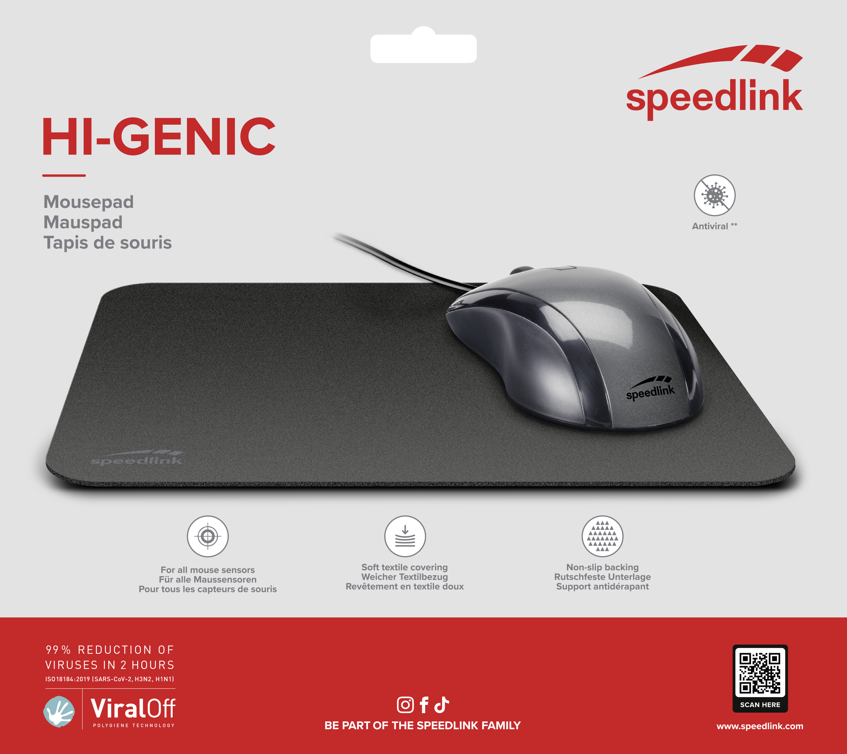 Das HI-GENIC Mousepad ist eine clevere Wahl für den privaten Gebrauch zu Hause sowie für belebte Arbeitsplätze oder öffentliche Räume. Dank der ViralOff-Beschichtung von Polygiene reduziert das Pad innerhalb von zwei Stunden 99% aller SARS-CoV-2, H3N2 und H5N1 Viren* auf seiner Oberfläche. Die robuste, jedoch weiche Textiloberfläche ist zudem besonders angenehm im Umgang und für alle Maussensoren geeignet. Aufgrund der rutschfesten Unterseite bleibt das Mauspad auch auf glatten Oberflächen immer an seinem Platz.