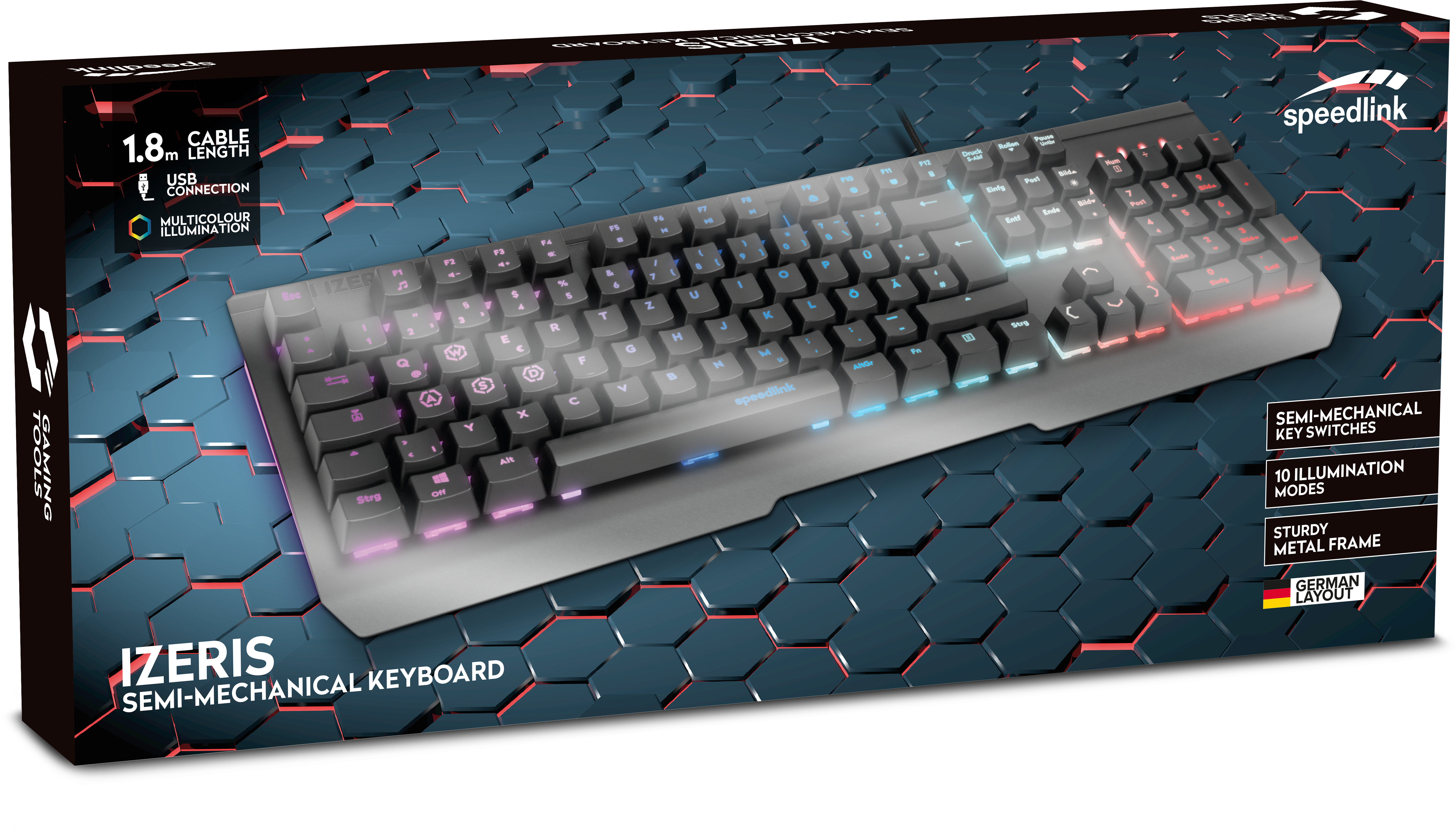 Das IZERIS Semi-mechanical Gaming Keyboard wartet auf dich und dein Game mit einem breiten Spektrum an professionellen Eigenschaften. Die halbmechanischen Tasten zeichnen sich durch einen geringen Schaltweg und das zügige Übermitteln von Befehlen aus. Sie haben einen klar definierten Druckpunkt und ermöglichen perfekte Kontrolle in jeder Situation – so fühlt sich das Zocken genauso an wie auf einer vollmechanischen Tastatur. Außerdem bieten dir zwölf Multimedia-Tasten Direktzugriff auf wichtige Funktionen. Und auch optisch trumpft IZERIS auf: Mit zehn einstellbaren abwechslungsreichen Beleuchtungs-Modi bringt es geballte Farbpower in den Gaming-Room.