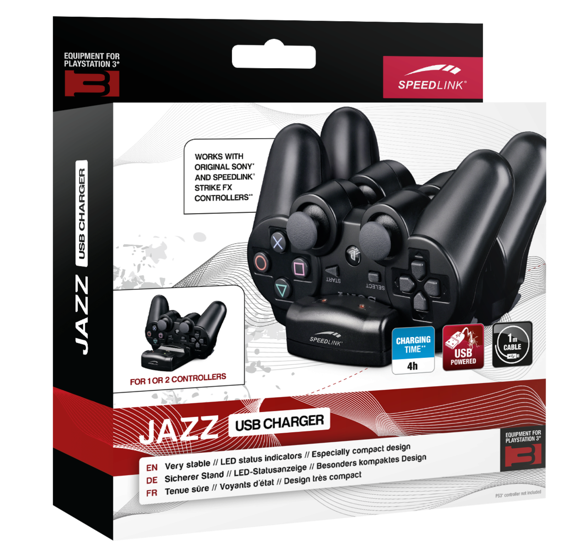 Der JAZZ USB Charger lädt Ihre kabellosen PS3®-Gamepads schnell und zuverlässig auf. Die kompakte Ladestation lässt sich direkt an der Konsole oder an einem beliebigen anderen USB-Anschluss (mindestens 500mA) betreiben – also auch an Ihrem PC oder Notebook. Das Gerät nimmt bis zu zwei SIXAXIS®-, DUALSHOCK®3- oder STRIKE-FX-Controller gleichzeitig auf und gewährt ihnen dank robuster Bauweise und rutschfester Unterseite sicheren Halt.
