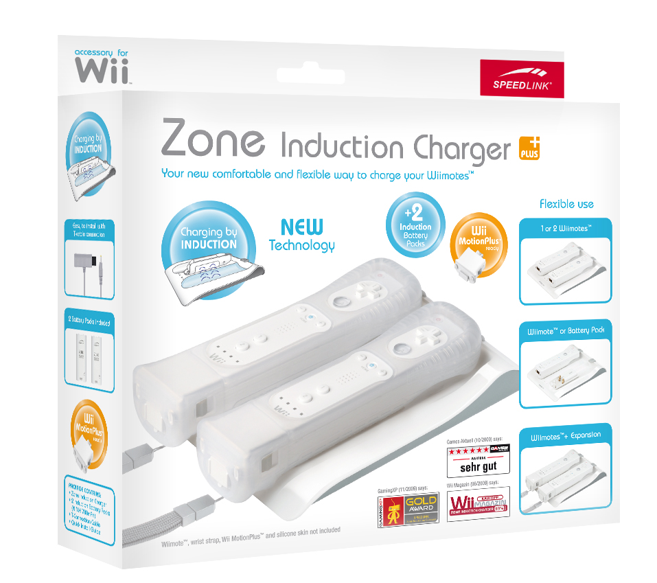 Mit dieser Ladestation können Sie bis zu zwei Wiimotes™ oder Akku-Sets gleichzeitig oder auch einzeln aufladen. Silikonhüllen, Nunchuk™ oder MotionPlus™ müssen nicht entfernt werden. In der Ladestation wird ein Induktionsfeld erzeugt, so dass es genügt, die Wiimotes™ einfach auf die Schale zu legen, ohne sie zu verbinden. Das Laden funktioniert auch bei ausgeschalteter Wii™-Konsole. Als Überladeschutz dient die automatische Stromunterbrechung nach 6 Stunden. Zwei Akku-Sets im Lieferumfang enthalten.