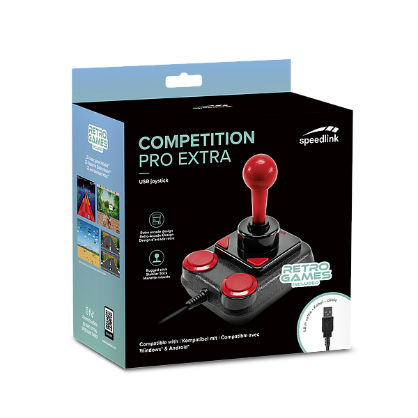 The COMPETITION PRO EXTRA USB joystick is an ode to nostalgic computer games. Its design with its unmistakable arcade machine stick and technology – such as the iconic micro switches with their loud click – is a throwback to the original COMPETITION PRO from the 80s, the famously popular joystick for home computers. Building on this the new stick has been designed for the digital era, making it perfect for arcade and retro games. And for you to enjoy some classic action, your COMPETITION PRO EXTRA comes with 25 games for download – including reinterpretations of retro gems such as Summer Games as well as arcade titles, all in the spirit of great home computer classics. With its DirectInput® support you’ll be gaming in no time at all – and there are no drivers to install either. And thanks to the joystick’s two round and two triangular fire buttons plus rapid-fire mode you’ll enjoy a huge gaming advantage. The COMPETITION PRO EXTRA is compatible with Windows® 7 or later and Android® devices via an OTG adapter. 80s here we come!