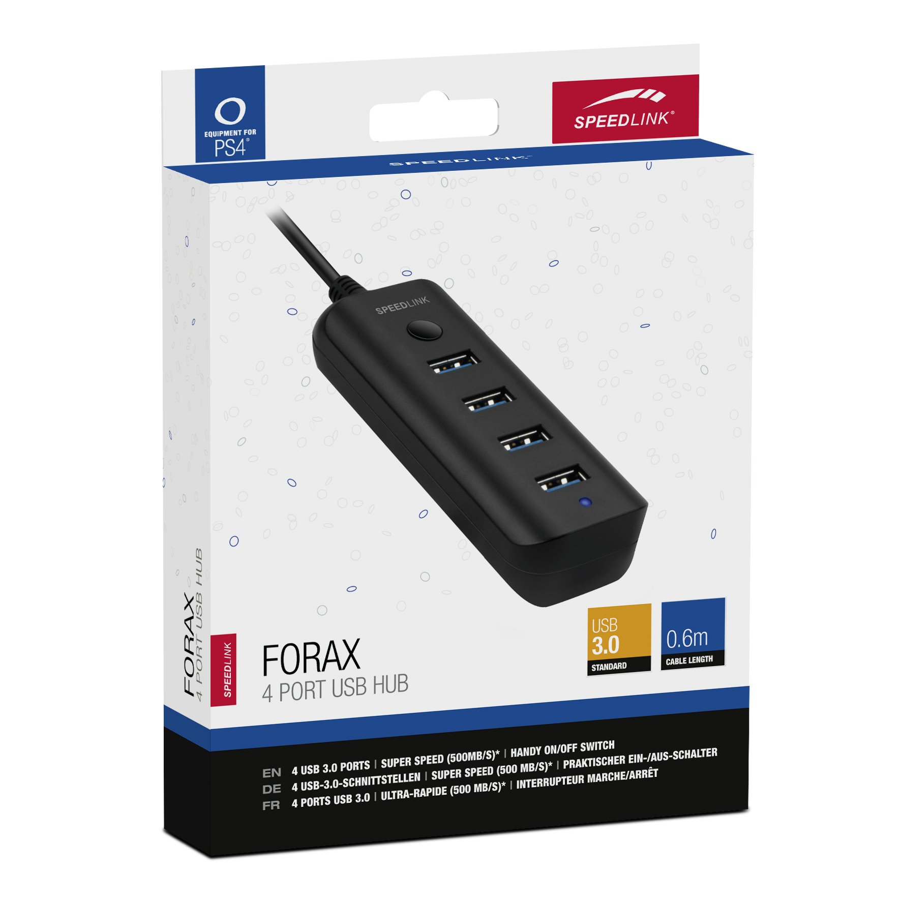 Tap the full potential of your PS4® with the FORAX 4-Port USB Hub. Add 4 USB 3.0 ports to your console and connect peripherals such as headsets, microphones, chargeable devices and storage media – all without the hassle of swapping cables. Thanks to the 60cm cable, you can store the high-quality FORAX hub discreetly beside or behind your PS4®.