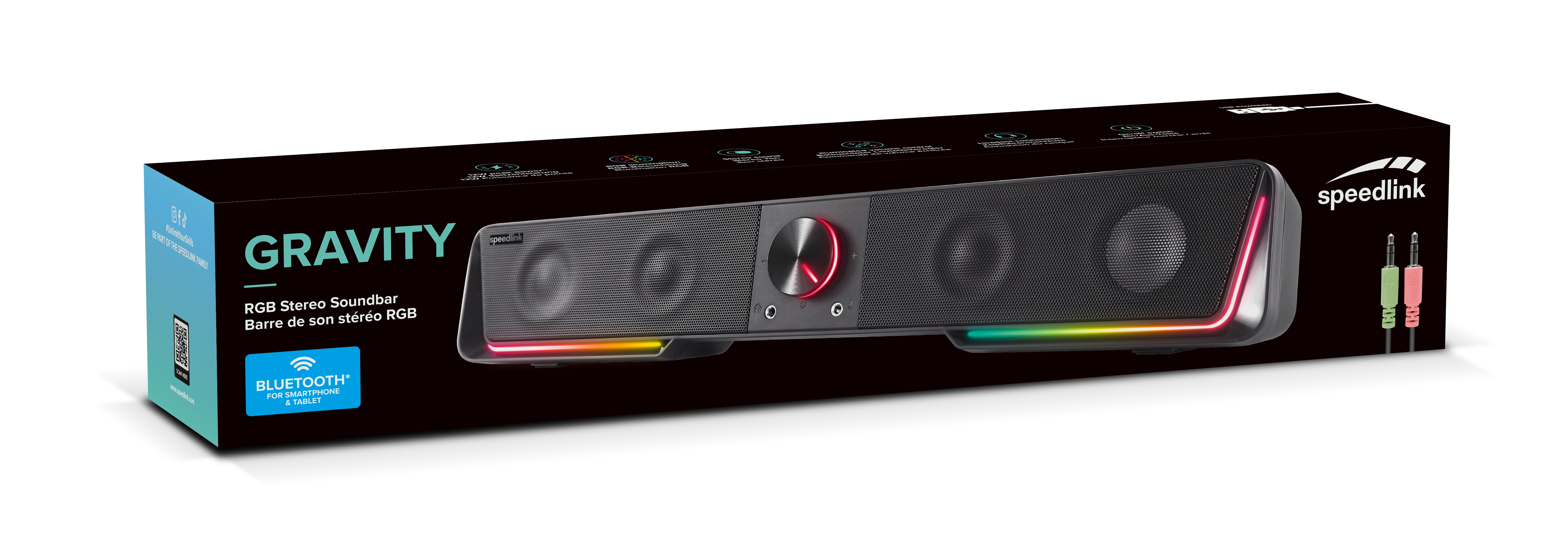 The GRAVITY RGB Stereo Soundbar brings demanding gaming soundscapes to life with breathtaking quality. The excellent stereo sound is accompanied by brightly coloured RGB lighting that creates a pleasant atmosphere for every session. Two connections on the front of the soundbar make it easier to use headphones and microphones, so you don’t have to switch cables on the computer. Smartphones and tablets can be connected to the GRAVITY RGB via Bluetooth®. This means you can enjoy numerous applications and media with the first-class acoustics of the compact sound system.