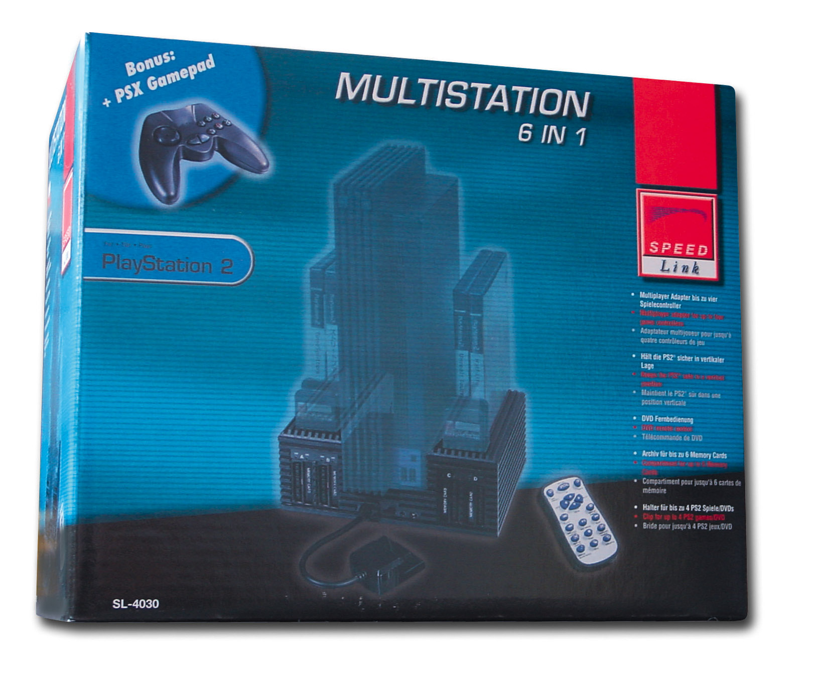 The MultiStation can be connected to the PS2 via link cable. It offers 2 additional scart inputs to connect, for ex. a video reorder. You may connect other gamepads to the 4 PS2 controller ports and use the memory card slots for multiplayer games. In addition, the MultiStation offers space for up to 4 PS2 games or DVDs and 6 memory cards. The remote control offers comfortable and easy maniability of DVD functions. A PSX gamepad is included as special bonus!
