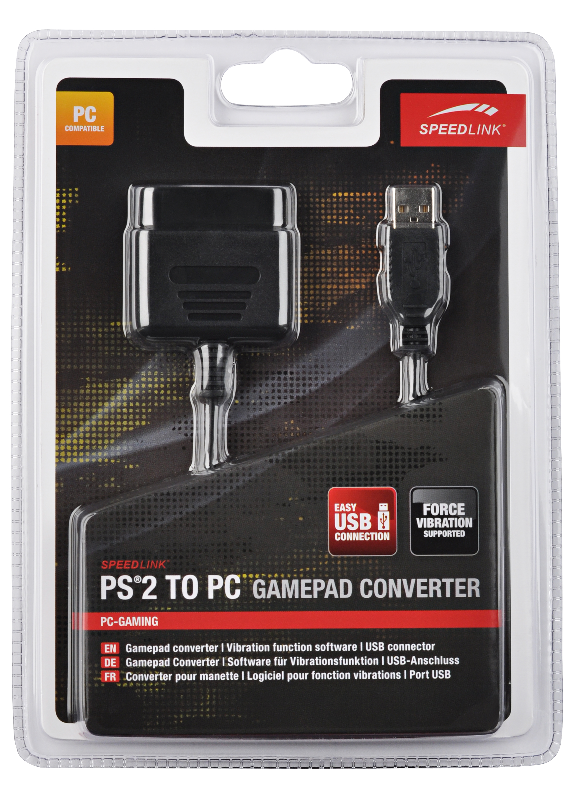 Use your PlayStation®2 gamepad, including the force vibration function, on any computer! Just connect your gamepad to the converter and plug it into your computer – that’s it. You won’t need to buy a PC-compatible gamepad. All the software’s included to support force vibration. Experience that PS2 feeling on your computer!