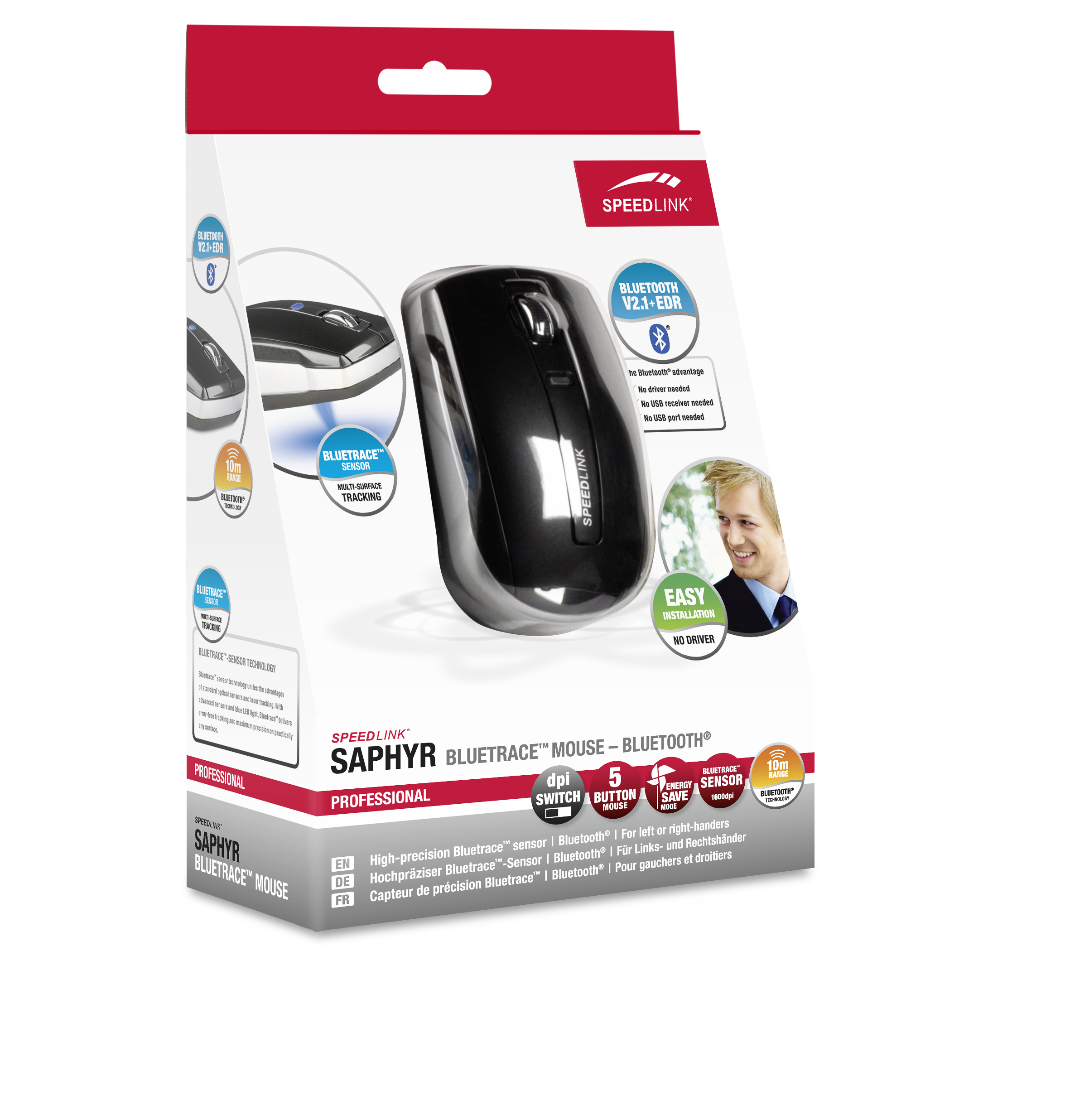 Bluetrace™ sensor technology delivers error-free tracking and maximum precision at home on the desktop as well as on practically any surface while out and about. With its rubberised scroll wheel and practical dpi switch for rapid changing of the sensor sensitivity level, the SAPHYR offers the ultimate in ease-of-use. Thanks to Bluetooth® technology, the mouse offers quick and driverless installation on any Bluetooth®-ready PC, notebook or Mac – plus can work at a cable-free distance of up to 10 metres. Advanced technology and the highest build quality make the compact yet ultra stylish SAPHYR a reliable companion that will serve you well for many years.