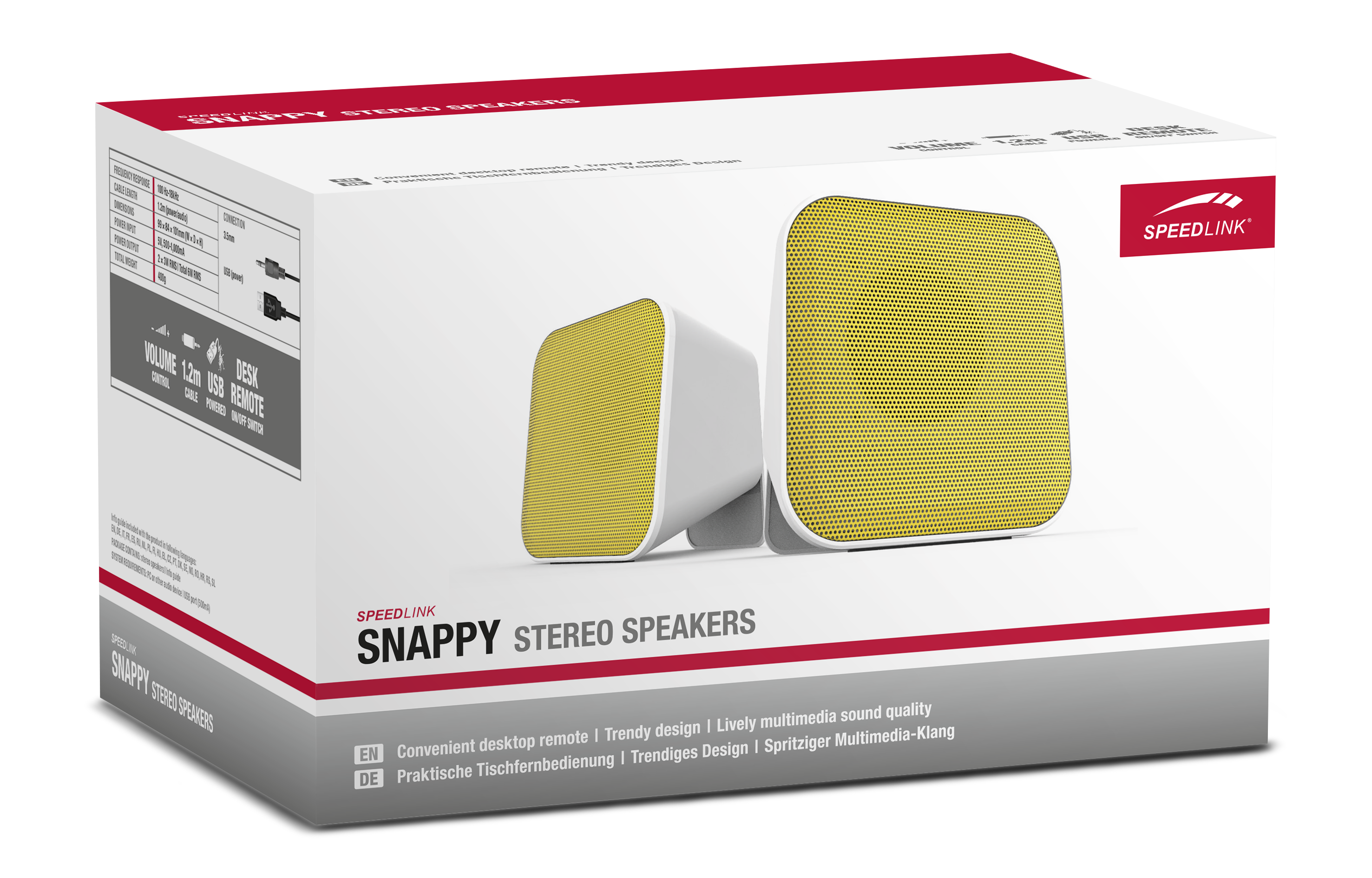 Lead a mobile lifestyle? Then you need some music to go along with it – SNAPPY Stereo Speakers will deliver this wherever you are. Their compact design and low weight make them the perfect companion for your notebook or smartphone – plus, you’re freed from the mains as they’re USB powered. Thanks to their trendy design, they’ll also look good on your desktop – or anywhere where you need big sound in a little package.
