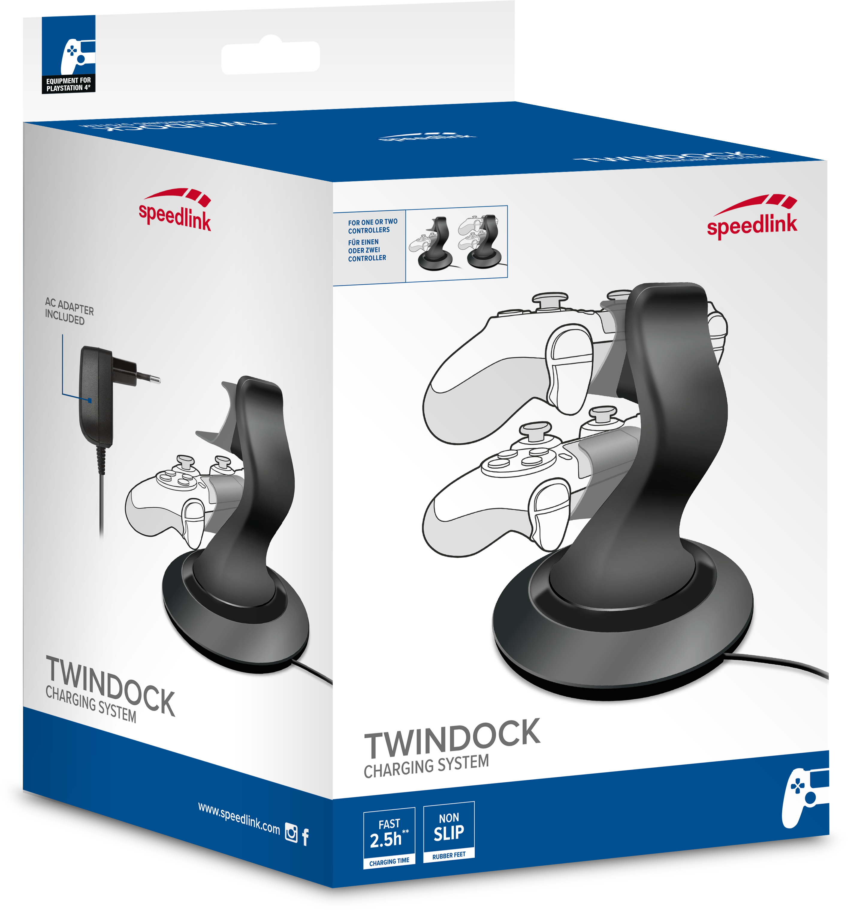 Charge your PS4® controllers quickly and reliably with the TWINDOCK charging system. Charge up to two controllers simultaneously and save the hassle of waiting. The proven, convenient docking system also holds your controllers securely in place – simply dock them and they'll start charging instantaneously. The rubberised feet prevent the charging system from sliding around, so it always stays rooted to the spot. What's more, besides the stylish design the TWINDOCK Charging System is highly durable as it’s designed for daily use. Thanks to its compact size and the practical arrangement of the charging slots, you can use the charging station wherever you want – plus, you'll always have your controllers ready to hand and neatly arranged.