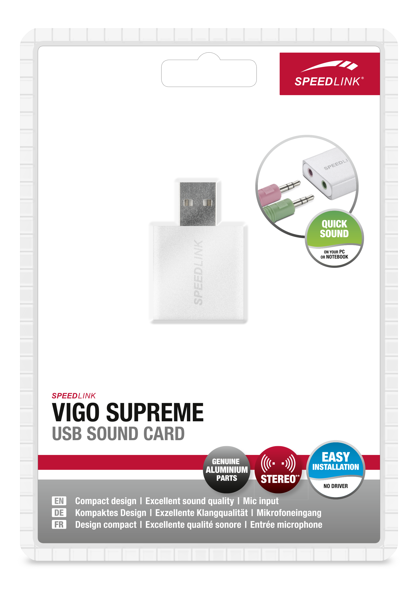 Add flexibility quickly and easily to enhance your PC entertainment experience. The VIGO Supreme USB sound card is the simplest way to add additional headphone and microphone sockets to your PC. Just plug the sound adapter into any USB port – you don't even need to install a driver. Thanks to its plug & play functionality, you can use your VIGO Supreme straight away to listen to your music, enjoy game sound effects and make internet calls. And with its compact aluminium casing, it's perfect for mobile use with your notebook.