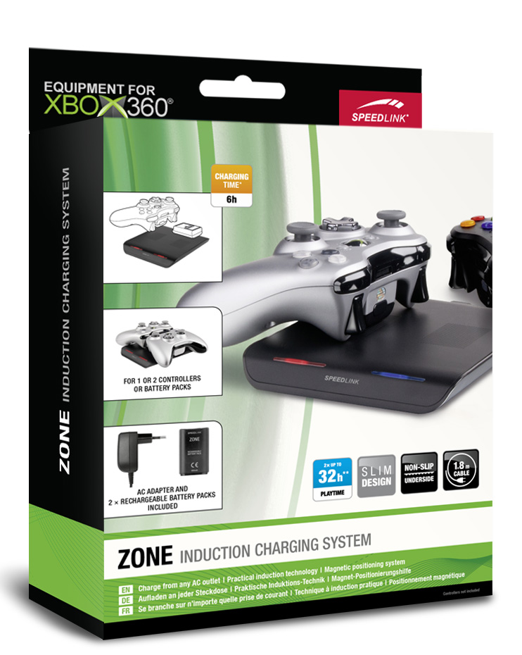 Always powered and ready for hours of gaming on your Xbox 360® – even in pairs: the ZONE Induction Charging System charges up to two Xbox 360® gamepads, with the accompanying NiMH battery packs each providing up to 32 hours of gaming time per charge. Thanks to the ultra-convenient induction-charging technology, you don’t have to plug in any cables or dock the controllers – all you need to do is place them on the compact charging station. You’re not tied to the console either as the accompanying AC adapter lets you power the charging system from any 230V AC outlet.