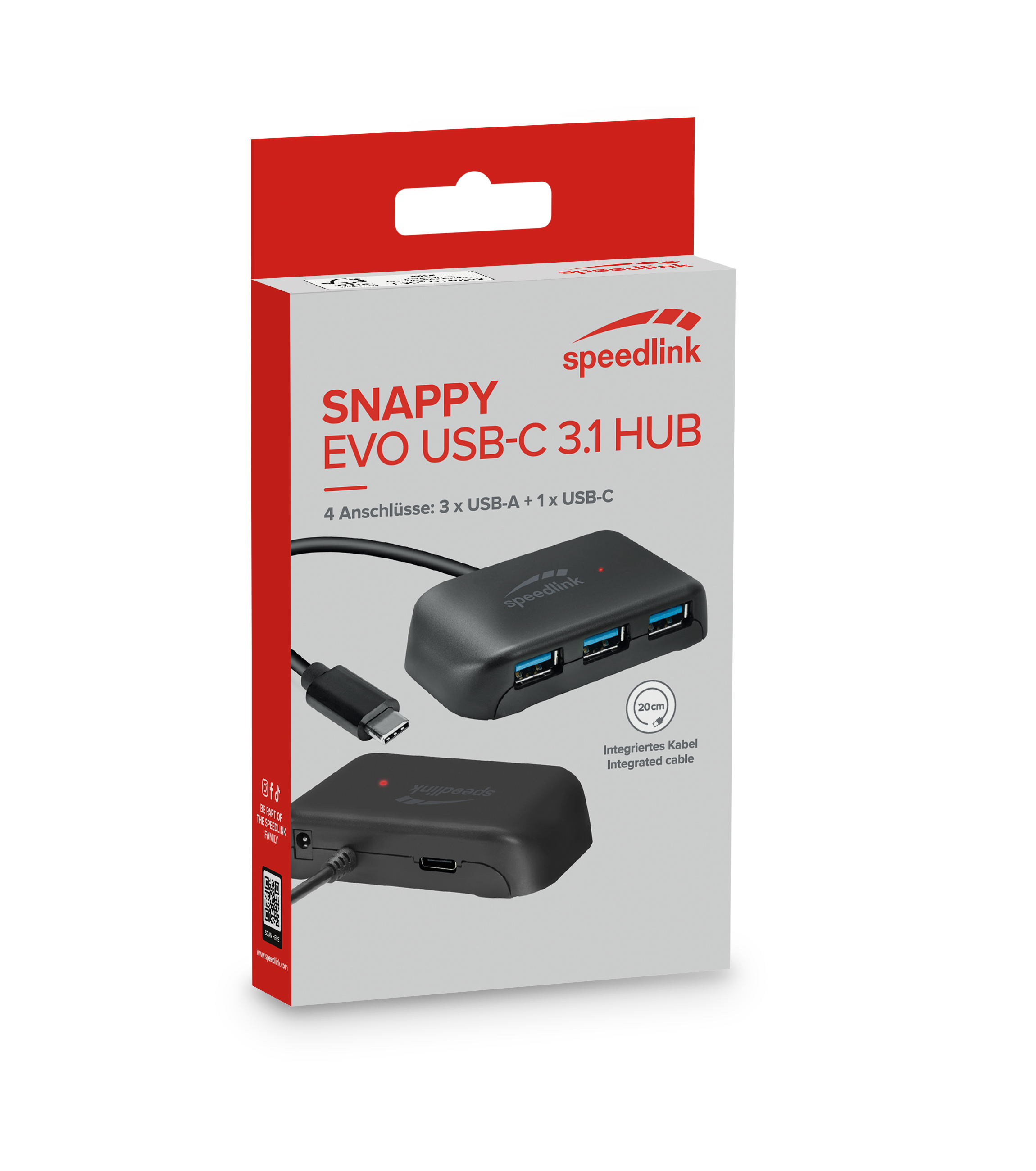 Easily turn one USB-C interface into 4 practical USB interfaces (3 x USB-A and 1 x USB-C). The SNAPPY EVO USB-C to USB 3.1 hub ensures super-fast data transfer of up to 5 Gbit/s and, for example, lets you connect and use external storage media immediately thanks to the simple plug & play installation. Its compact design fits modern hardware and takes up little space, making it easy to transport.