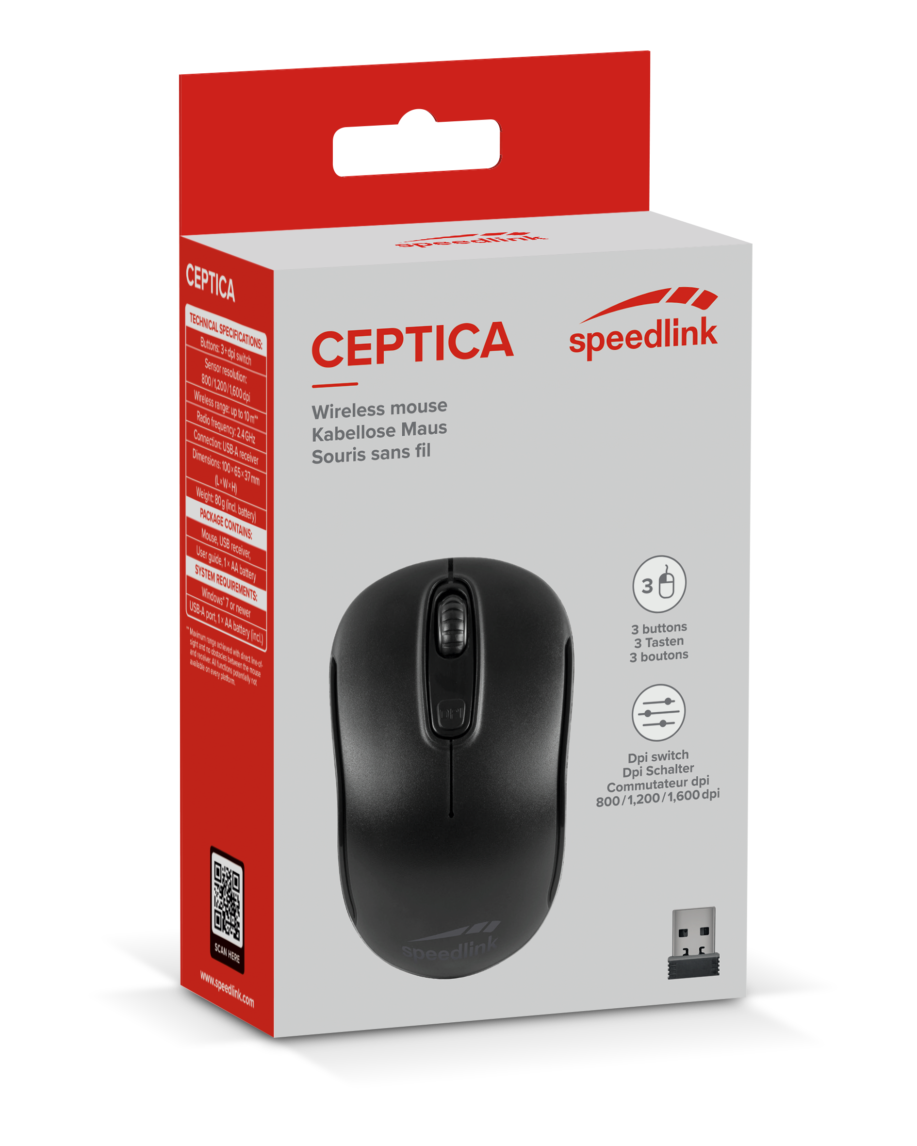 The Ceptica wireless entry-level mouse is universally usable thanks to its symmetrical shape, suitable for left- and right-handed users. The proven 2.4 GHz technology ensures a comfortable movement radius of up to 10m around the computer. Three buttons, the simple design and the precise sensor with adjustable 800/1,200/1,600dpi complete the functional wireless mouse.