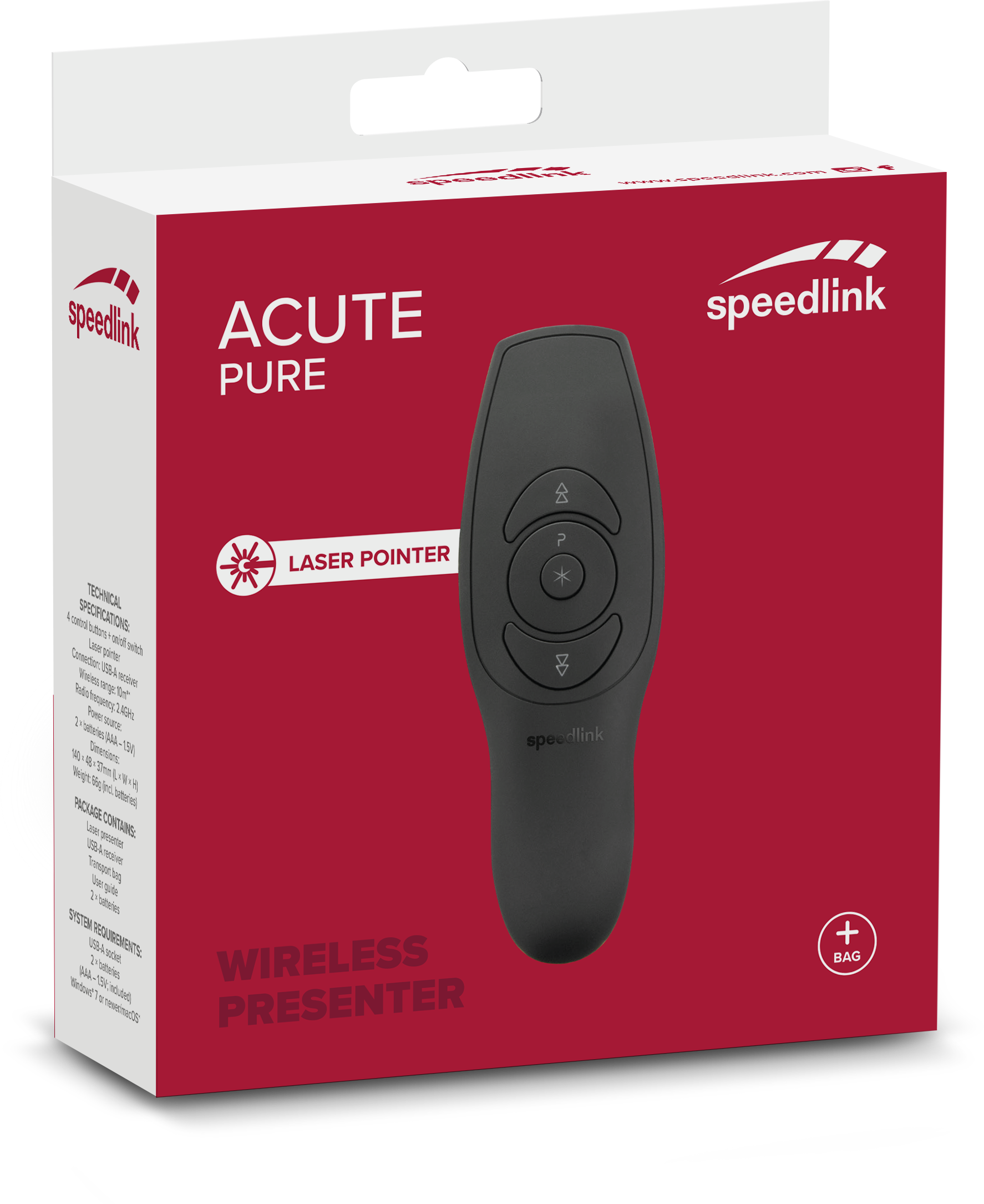 Mit dem kabellosen Presenter ACUTE PURE und seinem integrierten Laserpointer steuern Sie Ihre Präsentation auf professionelle Weise. Mit 4 Steuerungstasten starten oder beenden Sie die Präsentation, schalten entspannt durch die Folien oder aktivieren den Laserpointer. Sie können alle Funktionen dank erprobter 2,4-GHz-Funktechnik in einer Entfernung von bis zu 10 Metern rund um den Computer nutzen. Zu dem Presenter gehört eine komfortable Transporttasche.