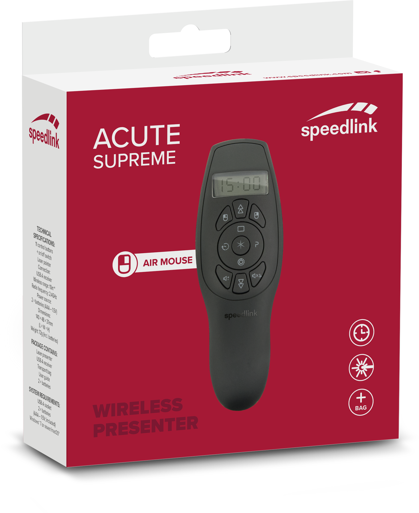 Mit dem kabellosen Presenter ACUTE SUPREME und seinem integrierten Laserpointer steuern Sie Ihre Präsentation auf professionelle Weise. Mit 11 Steuerungstasten schalten Sie entspannt durch die Präsentation, schalten den Bildschirm schwarz und wieder zurück, kontrollieren die Lautstärke, aktivieren den Laserpointer oder starten einen Timer. Mit diesem haben Sie Ihre Redezeit immer im Blick – ist sie abgelaufen, warnt Sie der Presenter durch Vibration. Dank des Air-Mouse-Modus können Sie den Mauszeiger durch Bewegung des Presenters steuern – die 2 Maustasten befinden sich unter den 11 Steuerungstasten. Sie können alle Funktionen dank erprobter 2,4GHz Funktechnik in einer Entfernung von bis zu 10 Metern rund um den Computer nutzen. Zu dem Presenter gehört eine komfortable Transporttasche.