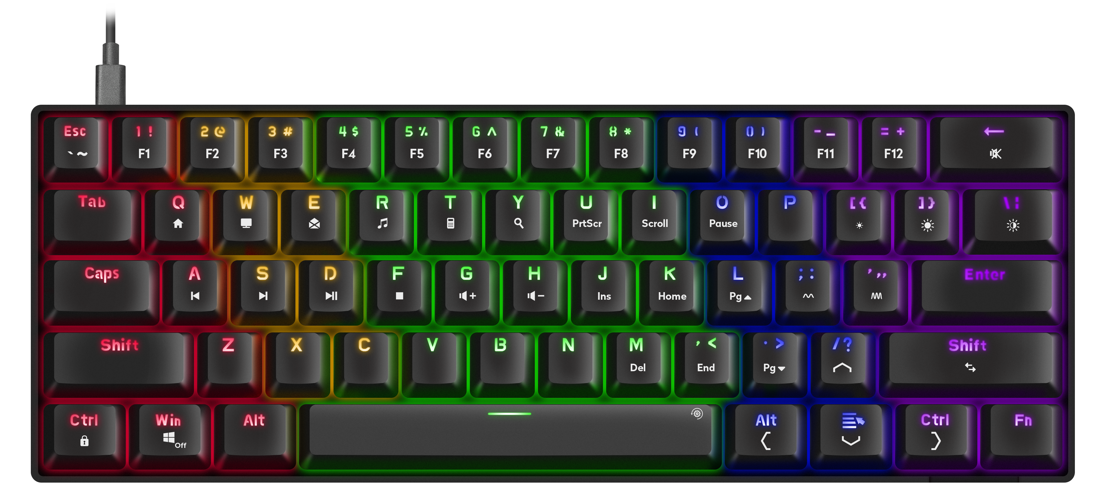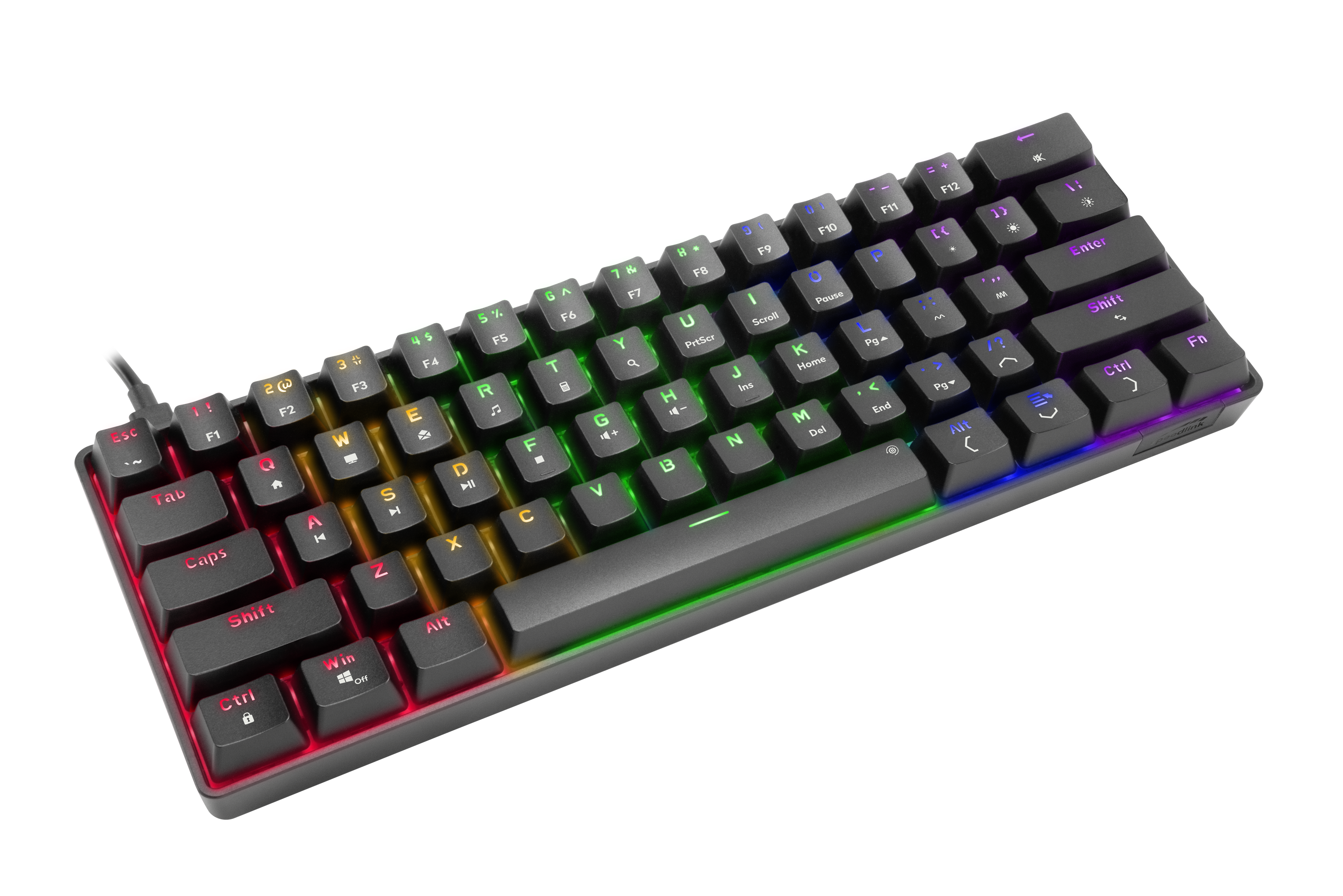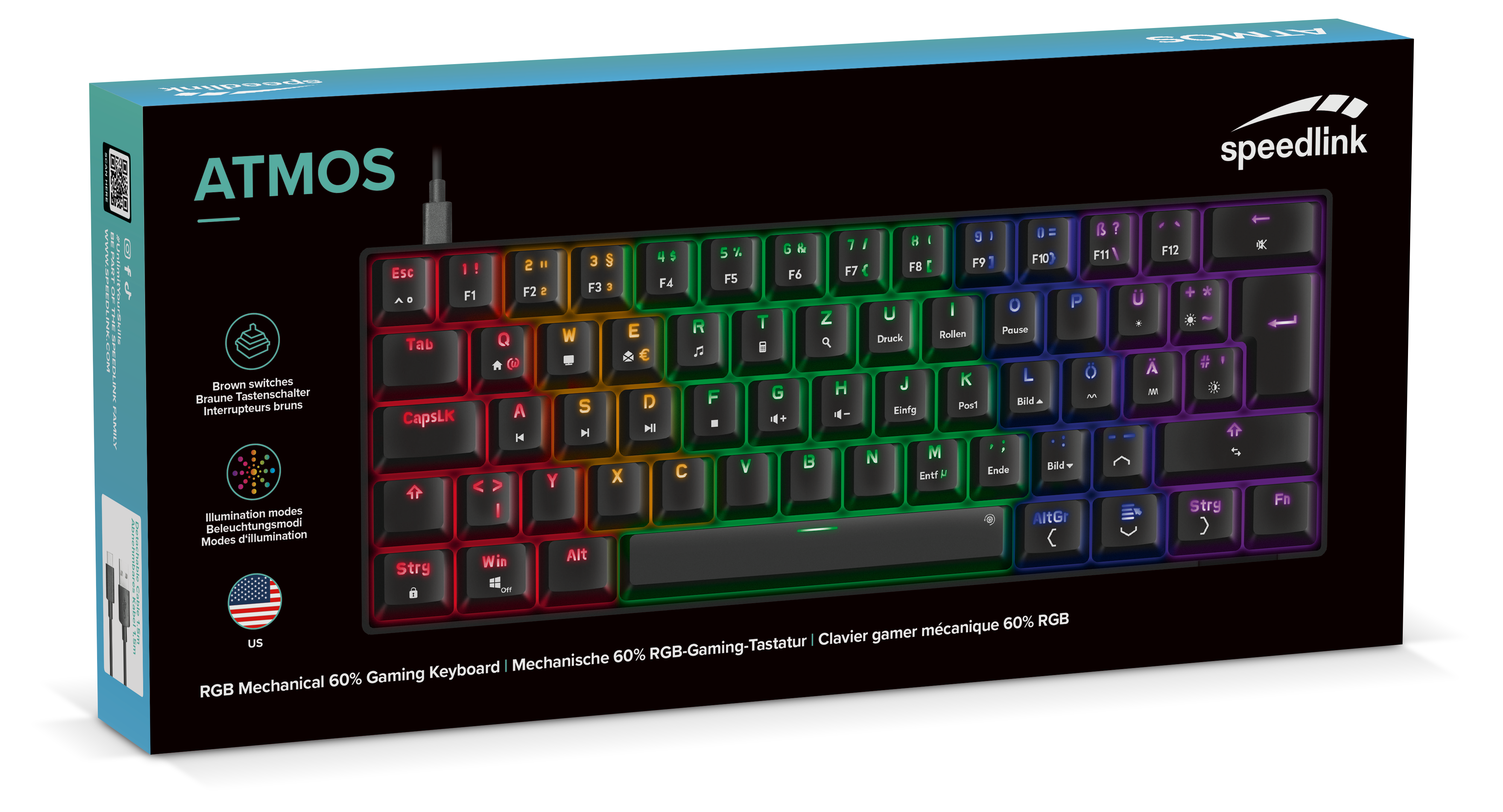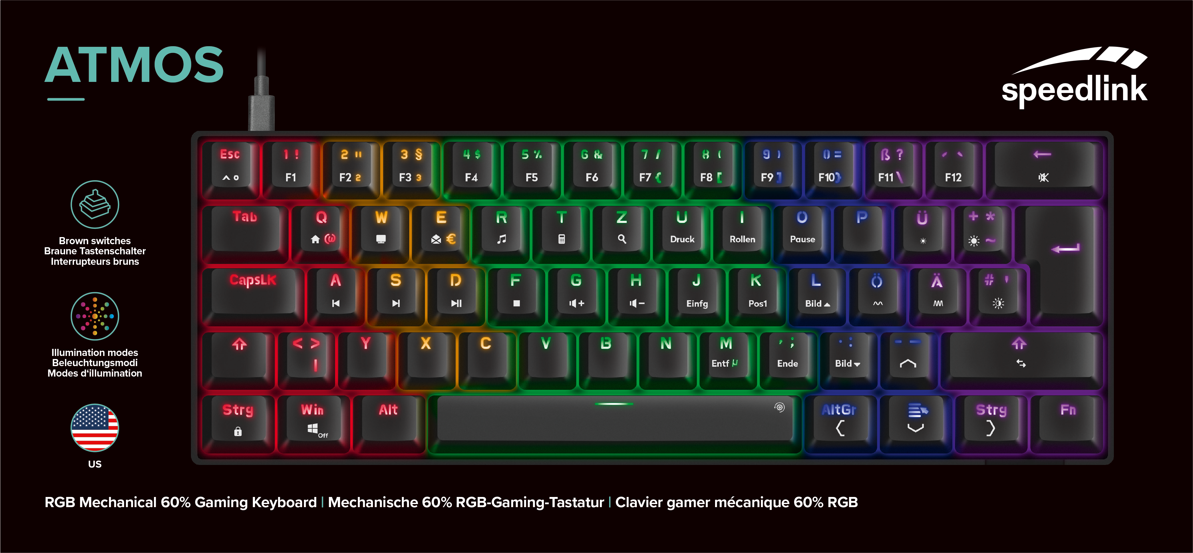 Das ATMOS RGB Rainbow Mechanical 60% Gaming Keyboard definiert das Spielerlebnis neu. Mit seiner robusten Stahlplatte und den mechanischen braunen Switches bietet es präzise Tastenreaktionen und eine beeindruckende Lebensdauer von bis zu 50 Millionen Anschlägen. Die Regenbogen-RGB-Beleuchtung in Verbindung mit einer Vielzahl wählbarer Lichteffekte macht das Keyboard zum idealen Bestandteil jedes Gaming-Setups. Das Keyboard zeichnet sich durch seine kompakte 60%-Größe aus und ist mit einem 1,65 Meter langen, abnehmbaren USB-C auf USB-A Kabel ausgestattet. Für optimalen Komfort ist die Höhe verstellbar, und Anti-Rutsch-Füße sorgen in jeder Situation für stabilen Halt. Dank Win-Key-Lock lassen sich ungewollte Unterbrechungen durch versehentliche Betätigungen vermeiden. Das N-key-rollover stellt zudem sicher, dass jeder Tastenanschlag registriert wird, was für schnelle und fehlerfreie Eingaben essenziell ist. Ergänzt werden diese Funktionen durch erweiterte Steuerungsmöglichkeiten über die FN-Taste, einschließlich Zugriff auf zusätzliche Multimedia-Funktionen. Mit seiner durchdachten Konstruktion und den vielseitigen Features ist das ATMOS RGB Gaming Keyboard eine exzellente Wahl für Gamer, die keine Kompromisse in Bezug auf Leistung und Design eingehen möchten.