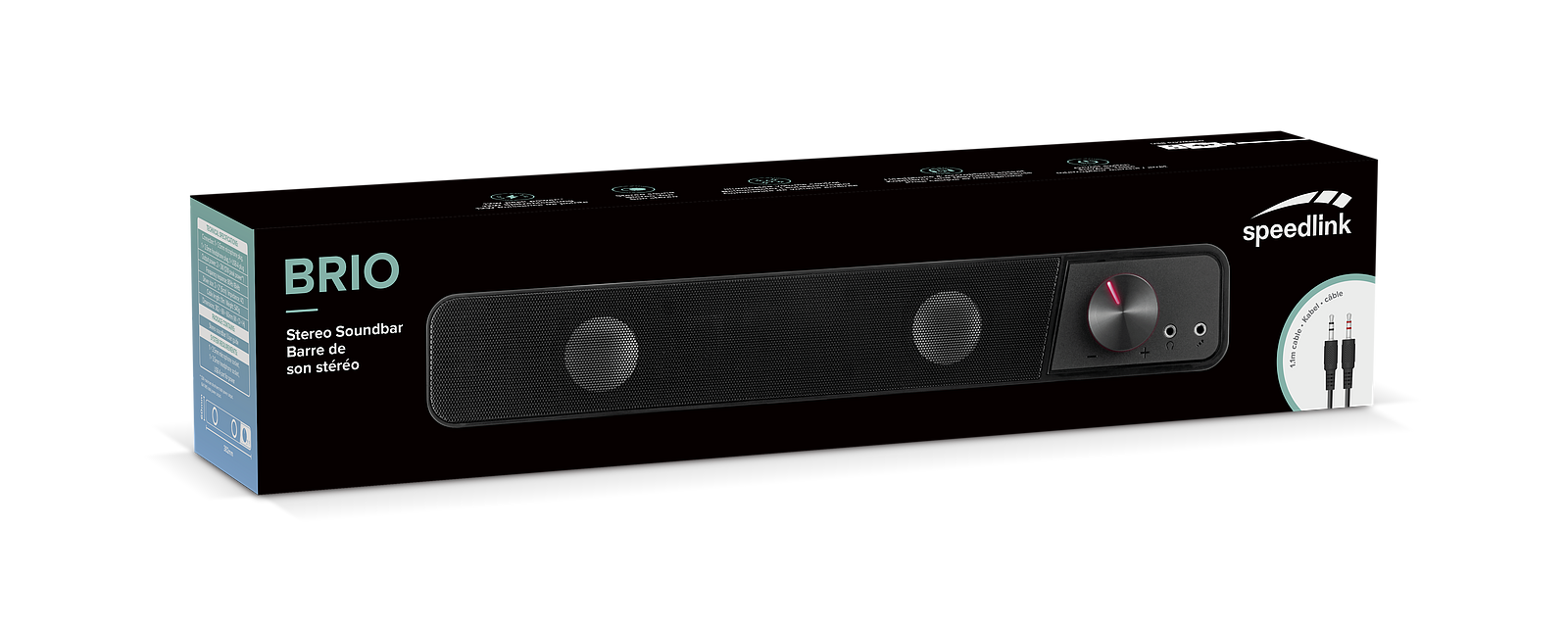 Ausgezeichnete Akustik und ein modernes Design – die BRIO Stereo Soundbar gibt in jeder Hinsicht den Ton an. Mit einer Leistungsspitze von 12 Watt füllt das kraftvolle Soundsystem jeden Raum mit exzellenter Audioqualität. Dank der kompakten Abmessungen sowie der cleveren Anordnung der beiden Lautsprecher, kann die BRIO einfach unter dem Computerbildschirm platziert werden. Diese Design-Eigenschaft spart Platz und schafft einen eleganten, aufgeräumten Arbeitsplatz. Der einfach zu bedienende und mit einer Beleuchtung hervorgehobene Laustärkeregler rundet das Konzept ab. Kopfhörer und Mikrofone können bei Bedarf direkt an der Vorderseite der Soundbar angeschlossen werden. Lästiges Kabelumstecken am Computer gehört somit der Vergangenheit an.