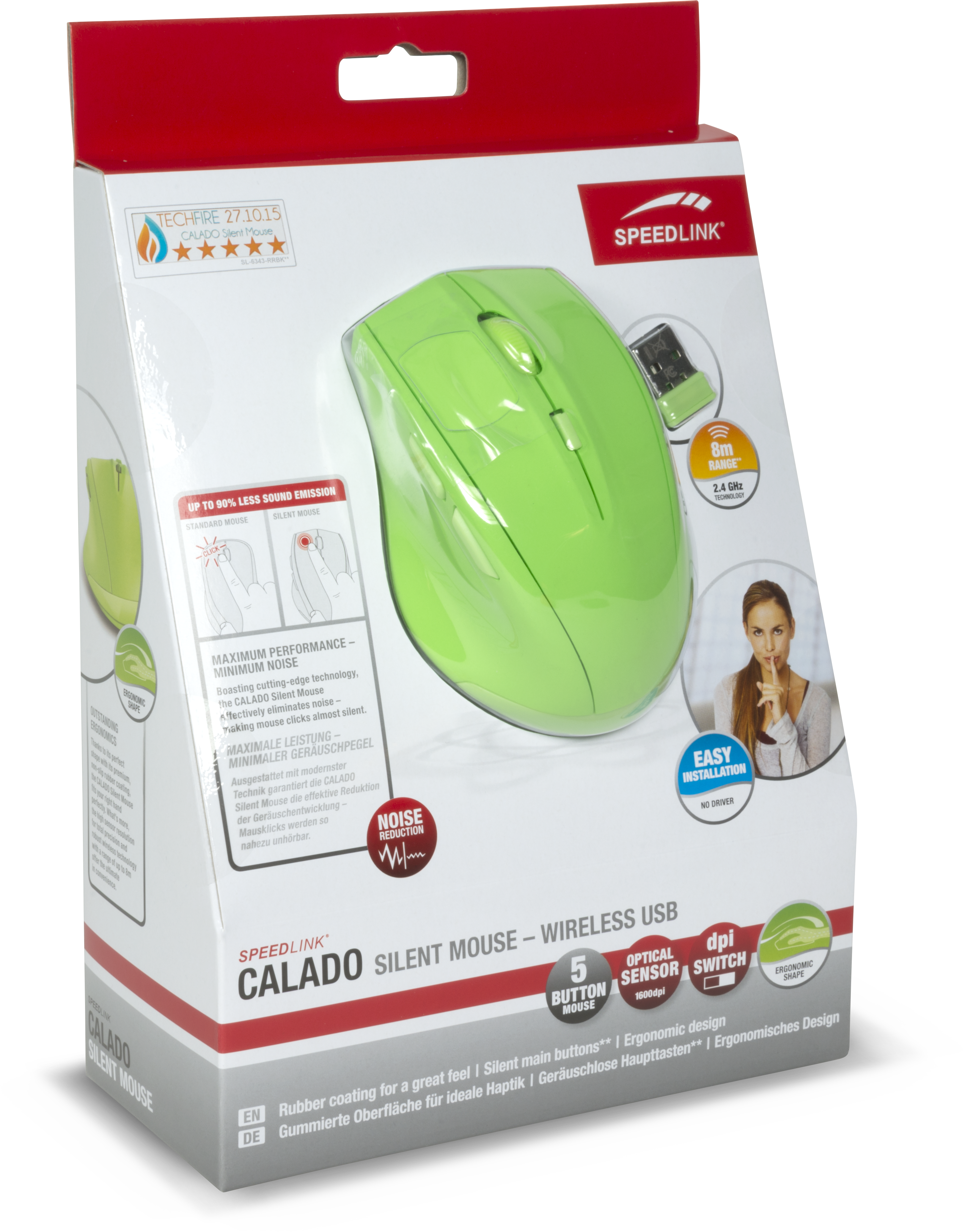 Bewahren Sie Ruhe im hektischen Büroalltag - die drahtlose CALADO Silent Mouse ermöglicht Ihnen flüsterleises, komfortables Arbeiten am PC. Die ausgefeilte Tastenmechanik reduziert effektiv die Geräusch-Emissionen bei der Benutzung der Maus - Klickgeräusche werden so nahezu unhörbar, Außenstehende fühlen ich nicht länger gestört. Im Vergleich zu herkömmlichen Mäusen wird die Lautstärke um bis zu neunzig Prozent reduziert. Dank ihrer angenehm kompakten Formgebung und dem hochwertigen, rutschfesten Rubber Coating ist die CALADO Silent Mouse perfekt an die Ergonomie Ihrer rechten Hand angepasst, mit einer Sensorauflösung von bis zu 1600 dpi garantiert sie eine präzise und flüssige Abtastung. Zuverlässige Funktechnologie erlaubt Ihnen zusätzlich kabellose Bewegungsfreiheit von bis zu acht Metern.