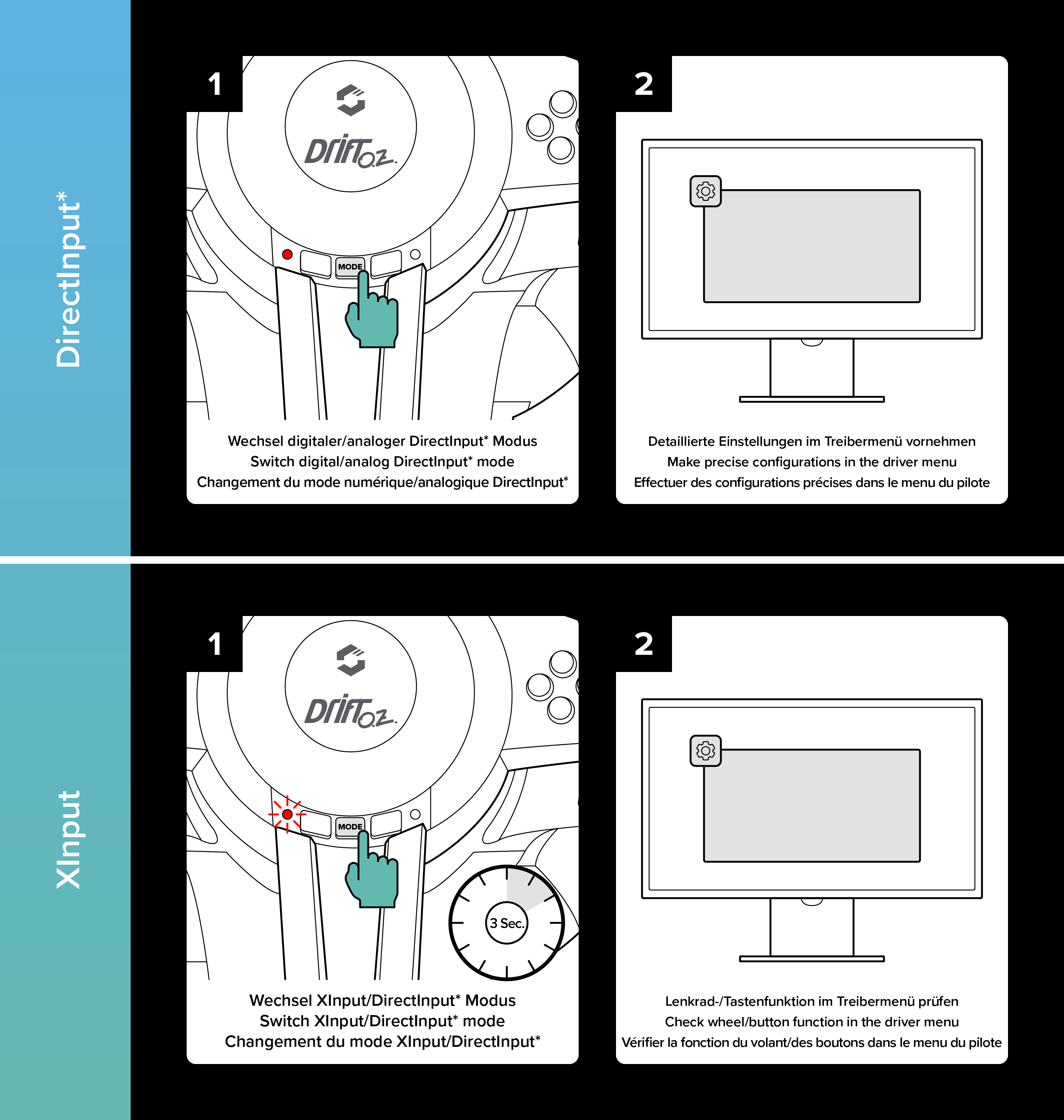Halte die „MODE“-Taste für drei Sekunden gedrückt, um zwischen den beiden Betriebsmodi des Lenkrads zu wechseln: XInput (für die meisten aktuellen Spiele) und DirectInput (für alle älteren und einige neuere Spiele). Leuchtet die rote LED (links), ist der DirectInput-Modus aktiv; leuchtet die grüne LED (rechts), befindet sich das Gerät im XInput-Modus.