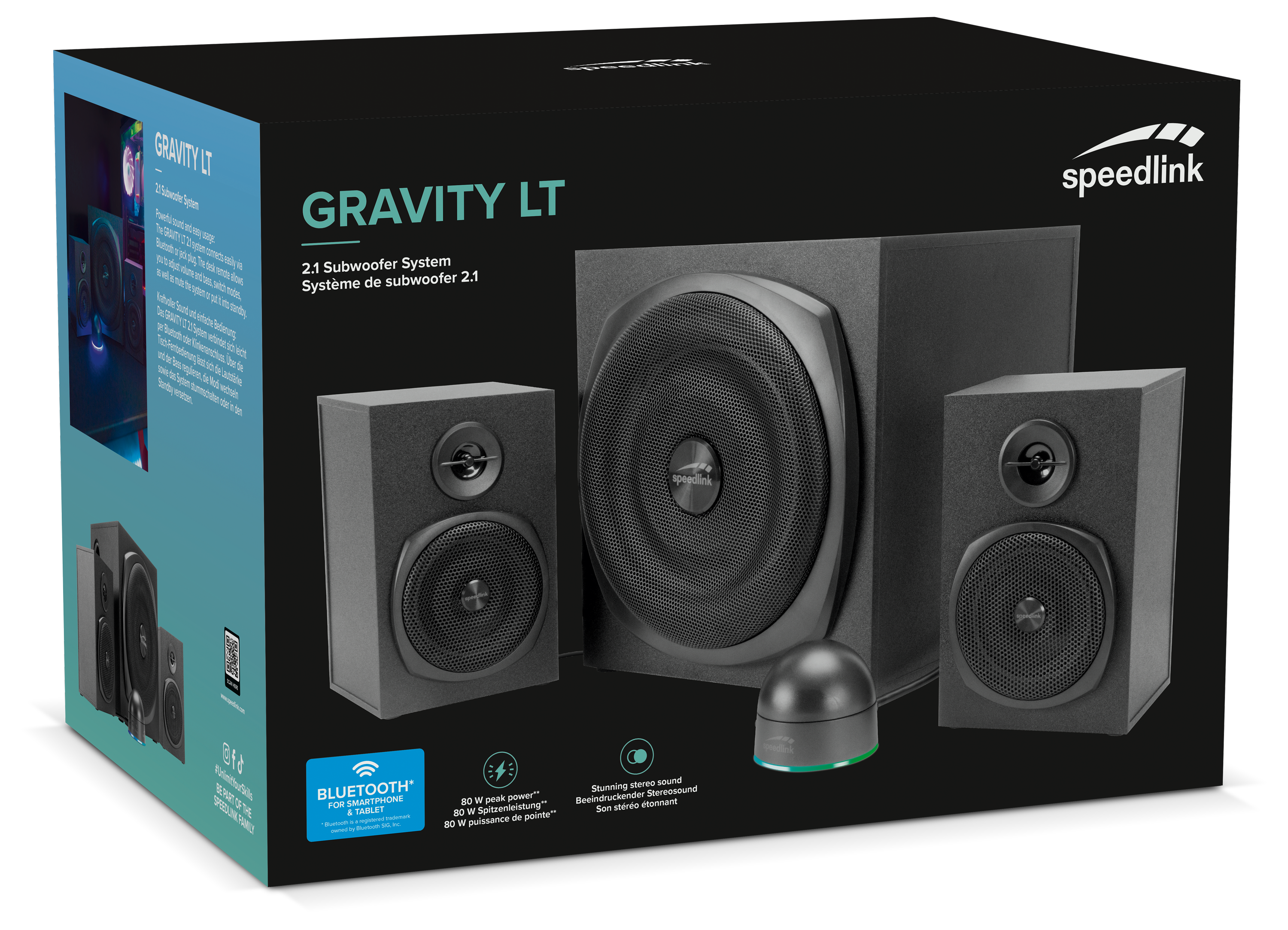 Das Speedlink Gravity LT 2.1 überzeugt als vielseitiges Multimedia-Lautsprechersystem mit sehr gutem Preis-Leistungs-Verhältnis. Es kombiniert druckvolle Bässe, klaren Hochton und einfache Bedienung in einem kompakten Paket.