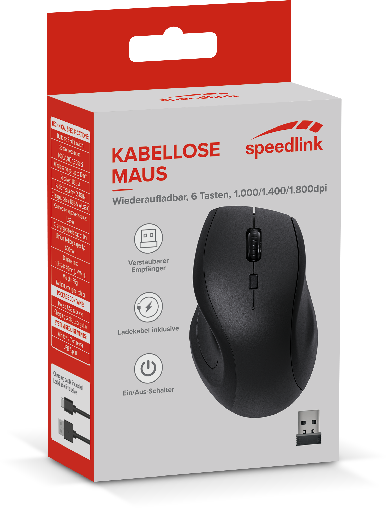 Die kabellose 6-Tasten-Maus kombiniert Präzision mit Benutzerfreundlichkeit, ausgestattet mit einem optischen Sensor und einstellbarer Auflösung von 1.000, 1.400 und 1.800 dpi für optimale Kontrolle. Sie ist wiederaufladbar, mit einer 600mAh Lithium-Ionen Batterie und kommt mit einem USB-C zu USB-A Ladekabel (1,2m Länge). Ergonomisch geformt für langanhaltenden Komfort, verfügt sie über einen kompakten Nano-USB-Empfänger, der in einem praktischen Fach verstaut werden kann und bietet eine stabile Verbindung über 2,4GHz Funktechnik bis zu 10m Reichweite. Der intelligente Stromsparmodus und ein Ein/Aus-Schalter maximieren die Batterielebensdauer.
