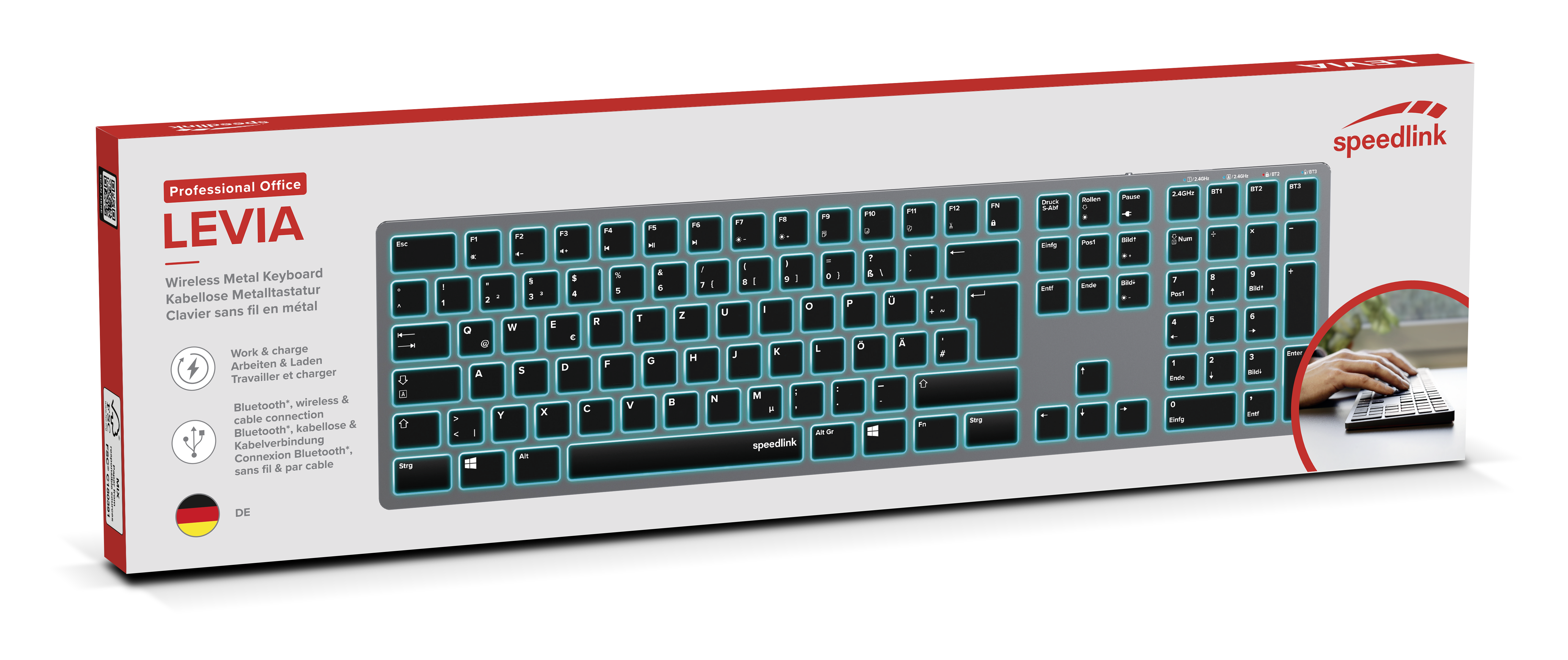 Beste Qualität für höchste Ansprüche. Die leistungsstarke LEVIA RGB Office-Tastatur mit stimmungsvollen Lichteffekten bietet volle Flexibilität durch den Triple Mode Anschluss. Die kabellose Verbindung mit 2,4GHz Receiver oder bis zu drei Endgeräten via Bluetooth garantiert volle Bewegungsfreiheit in einem Radius von bis zu 10 Metern. Die Tastatur verfügt über einen wiederaufladbaren 1.600mAh Akku, der ungestörtes Arbeiten über einen langen Zeitraum ermöglicht. Zum Laden und zur unmittelbaren Benutzung kann die Tastatur zudem über das 1,5 Meter lange Kabel verbunden werden. Dank des kompakten Designs und des Aluminiumgehäuses überzeugt die Tastatur mit hochwertigem Aussehen und ist besonders robust. Die gummierten Füße stellen allzeit maximale Stabilität sicher. Die LEVIA ist mit einem Vollformat Tastenfeld und zwölf Multifunktionstasten für eine einfache und effiziente Eingabe ausgestattet. Die Low Profile Scissor-Mechanik der Tasten sorgt für ein außergewöhnlich angenehmes Schreibgefühl. Eindrucksvolle Lichteffekte. Die ein- und ausschaltbare mehrfarbige RGB Beleuchtung bietet acht unterschiedliche Beleuchtungsmodi.