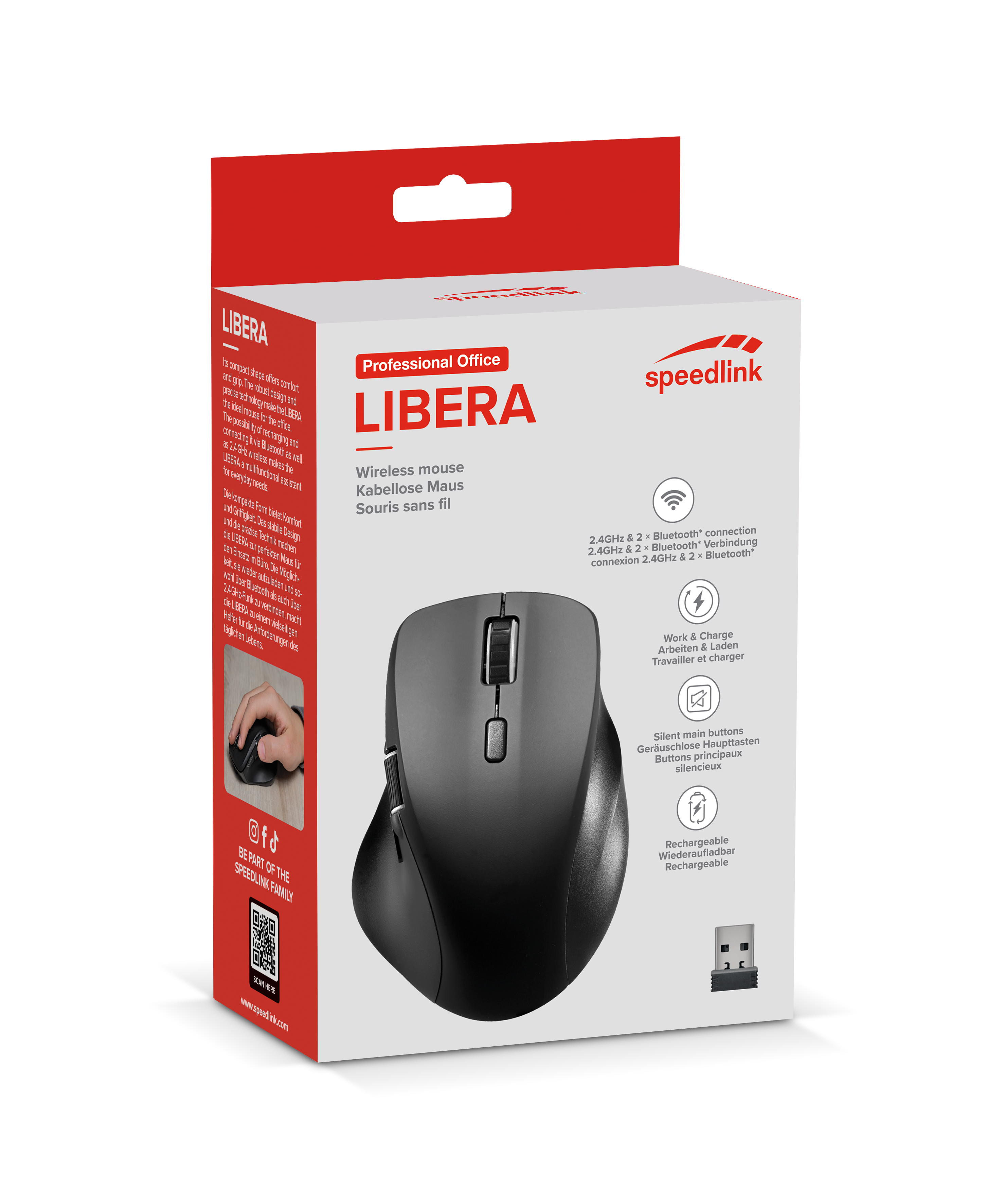 Die wiederaufladbare, kabellose LIBERA Maus vereint erstklassige Technologie und Komfort für ein unvergleichliches Benutzererlebnis. Mit einer Dual-Verbindungsoption - 2,4 GHz (1 Profil) und Bluetooth (2 Profile) - bietet unsere Maus die Flexibilität, sich nahtlos mit verschiedenen Geräten zu verbinden, egal, ob Laptop oder Tablet, die LIBERA ist immer einsatzbereit. Gedämpfte Haupttasten sorgen für nahezu lautlose und dennoch präzise Klicks. Darüber hinaus verfügt die LIBERA über ein zusätzliches, horizontales Scrollrad, womit die Navigation durch Dokumente und Webseiten zum Kinderspiel wird. Die Sorge um Batterien gehört ebenfalls der Vergangenheit an. Unsere LIBERA ist wiederaufladbar und spart damit den Ärger und die Kosten von Einwegbatterien. Während des Aufladens kann problemlos weitergearbeitet werden. Die kompakte Form, mit ihrer gummierten Oberfläche, wurde speziell entwickelt, um maximalen Komfort und Griffigkeit zu bieten.