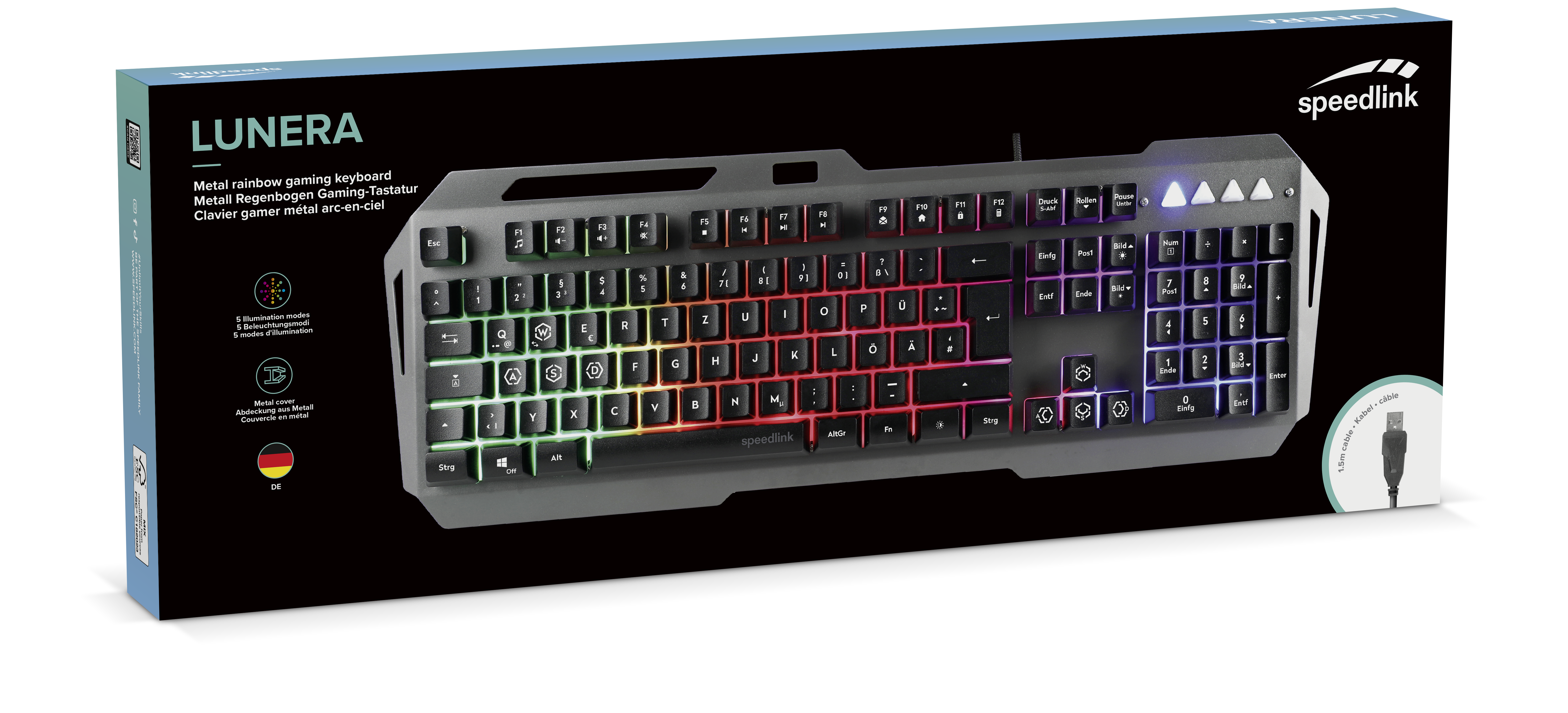 Mit dem LUNERA Metal RGB Rainbow Gaming Keyboard bist du für Abenteuer jeglicher Art passend aufgestellt. Die höhenverstellbare Tastatur mit robuster Metalloberfläche, Vollformat-Tastenfeld und hervorgehobenen WASD-Tasten wurde mit Blick auf die wichtigsten Gamer-Bedürfnisse entworfen und bietet optimale Vorrausetzungen für schnelllebige Missionen. Zugleich sorgt die mehrfarbige RGB Beleuchtung für eine stimmungsvolle Atmosphäre. Wähle zwischen drei verschiedenen Helligkeitsstufen oder dem lebendigen Breathing Effect. Des Weiteren helfen dir 12 Multifunktionstasten sowie eine abschaltbare Windows-Taste und austauschbare WASD- / Pfeiltasten immer die richtige Konfiguration zu finden. Die robuste Metalloberfläche macht die Tastatur nicht nur widerstandsfähig, sondern sieht auch besonders gut aus.