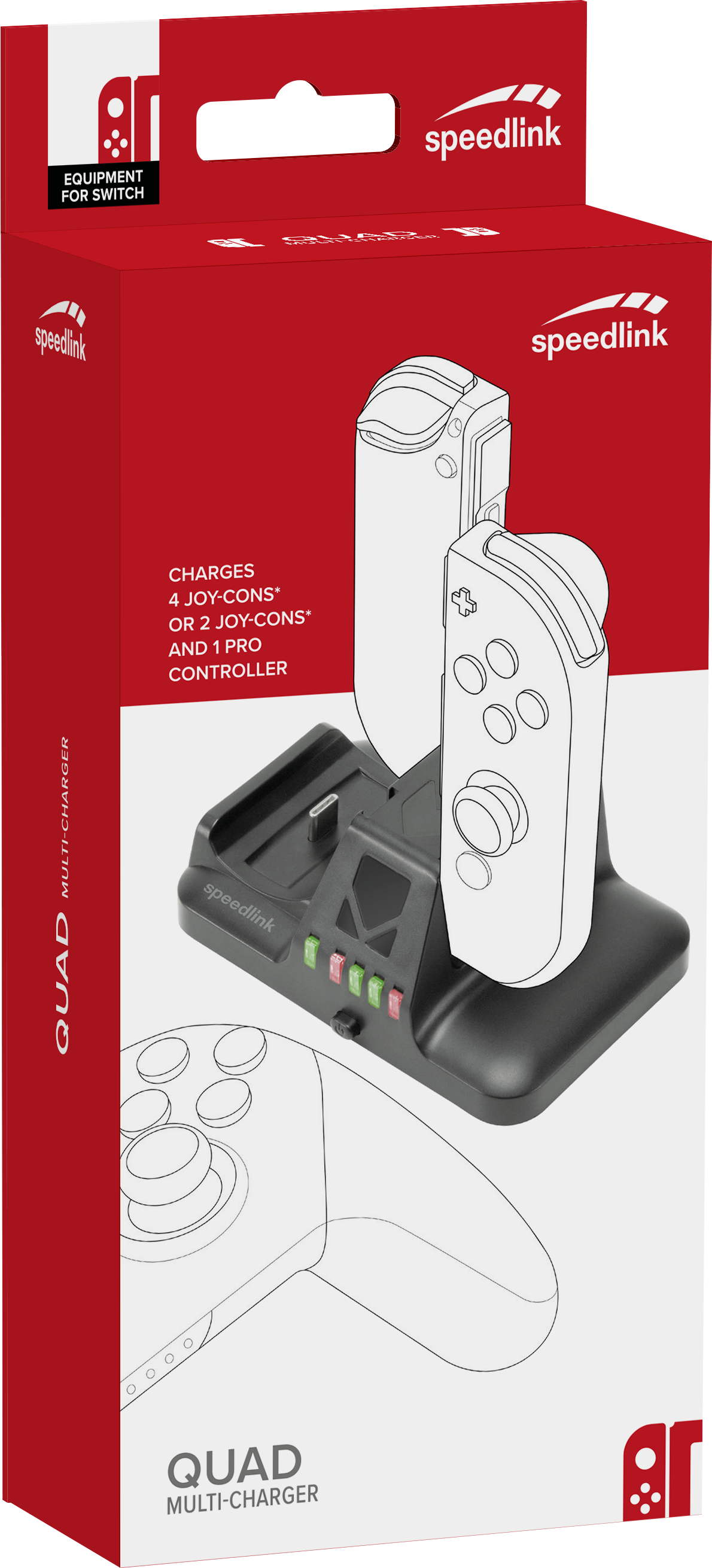 Das QUAD Mehrfach-Ladegerät ermöglicht dir das gleichzeitige Laden von vier Joy-Cons® oder zwei Joy-Cons® und einem Pro Controller – perfekt für das umfangreiche Equipment deiner Switch®. So brauchst du zum Beispiel nicht erst zu warten, bis deine Joy-Cons® wieder aufgeladen sind, sondern kannst mit einem zweiten Paar oder einem Controller weiter zocken. Oder aber du lädst deine vier Joy-Cons® auf, um mit drei Freunden das Maximum an Spielspaß zu genießen. Die Status-LEDs zeigen dir, wann die Joy-Cons® vollständig geladen sind und das Gaming weitergehen kann.