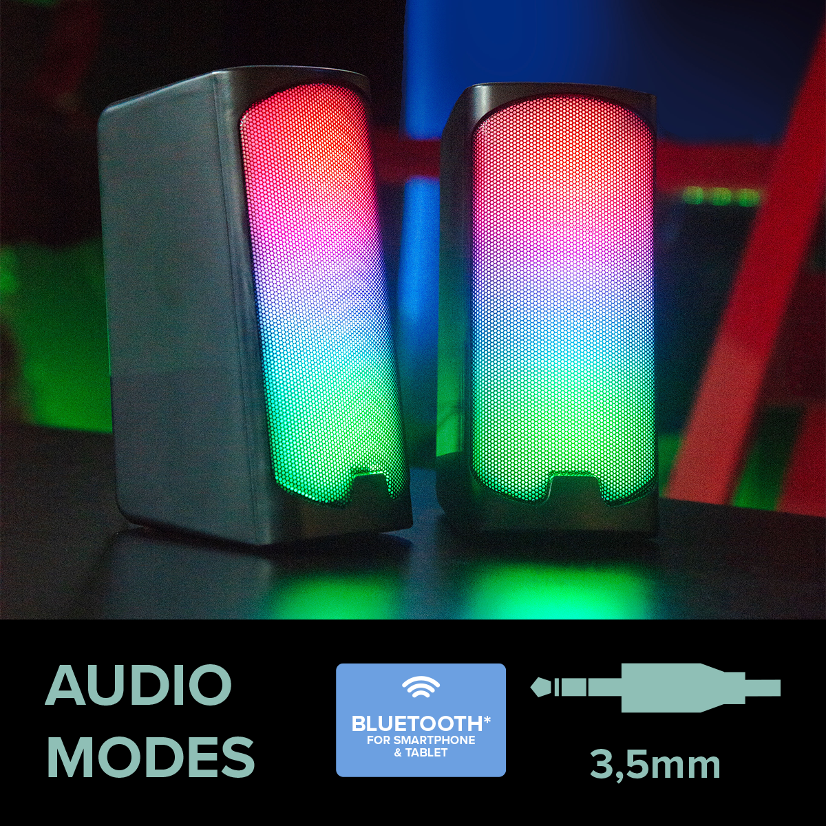 - Stereo-Lautsprecher mit vollflächiger RGB Beleuchtung