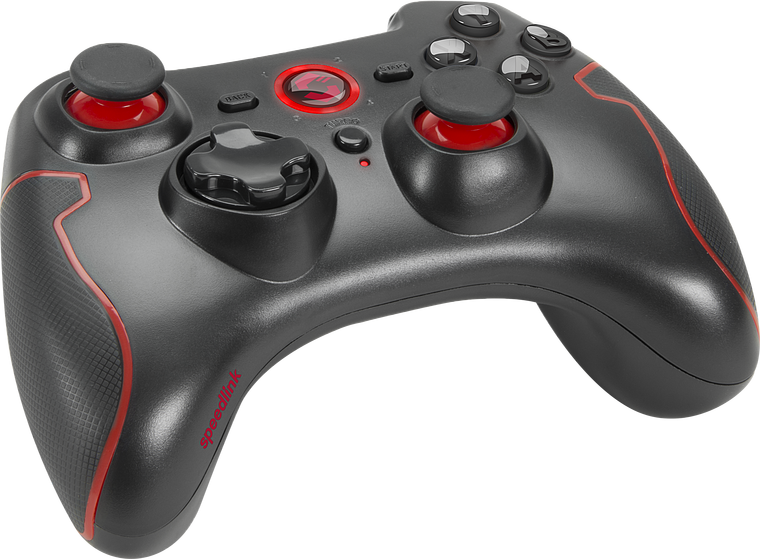 Das Gamepad wechselt nach fünf Minuten Inaktivität in den Standby-Modus (nach 30 Sekunden ohne hergestellte Funkverbindung), um Energie zu sparen. Drücke dann die „SPEEDLINK“-Taste, um es zu reaktivieren.