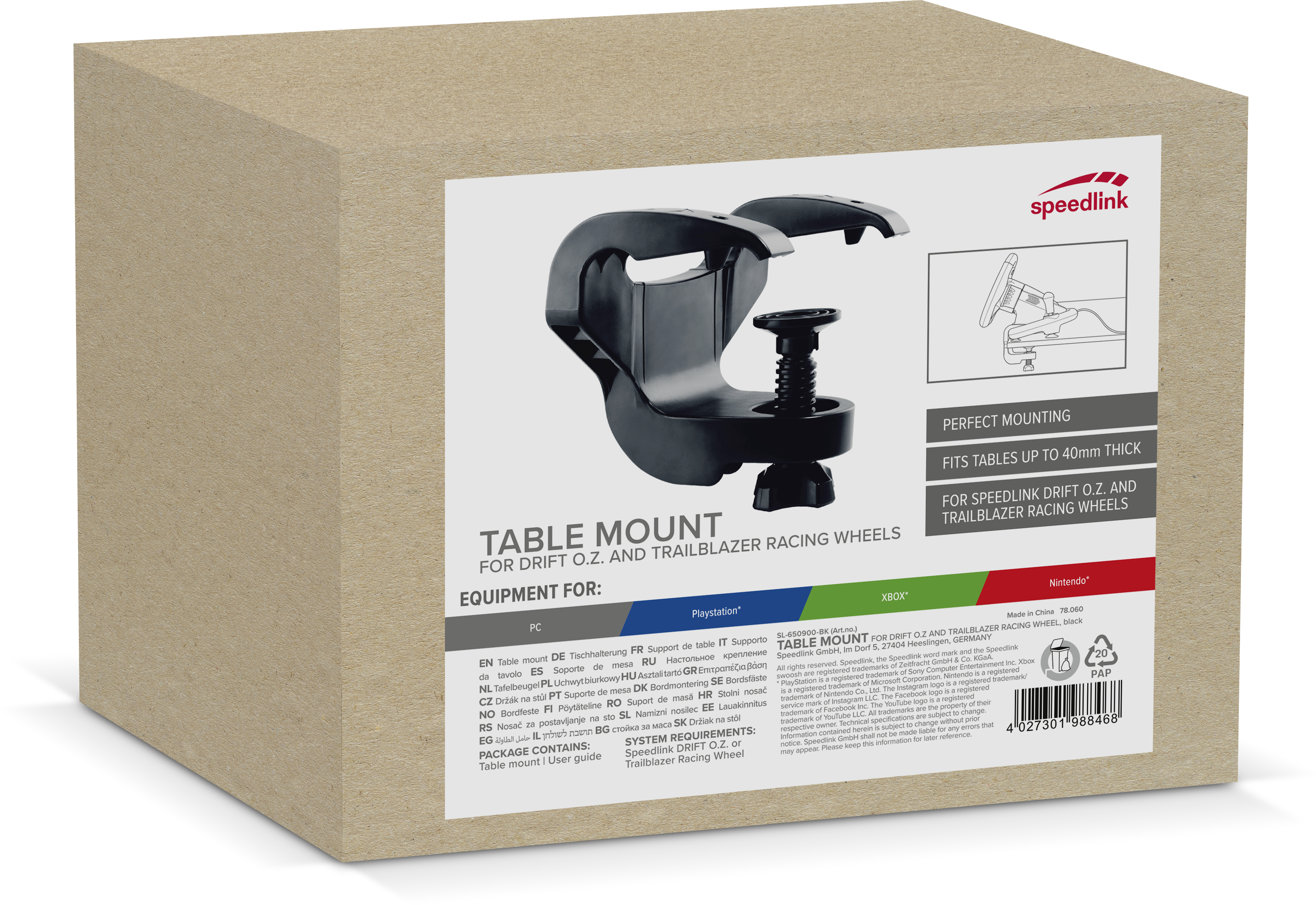 Alles im Griff – mit dem TABLE MOUNT für DRIFT O.Z. und TRAILBLAZER Racing Wheels maximierst du deinen Gaming-Spaß im Handumdrehen. Dank der unkomplizierten Handschraube kann dein Lenkrad kinderleicht an Tischplatten mit einer Stärke von bis zu 40 Millimetern montiert und befestigt werden. Somit ist auf kurvigen Rennstrecken und in aufregenden Momenten größtmöglicher Halt jederzeit garantiert. Die Tischhalterung ist mit dem Speedlink DRIFT O.Z. Racing Wheel für PC sowie mit dem TRAILBLAZER Racing Wheel für PC, PS4®, PS3®, Xbox® und Nintendo Switch® kompatibel. Mit dem TABLE MOUNT driftest du gekonnt um jede noch so enge Kurve!