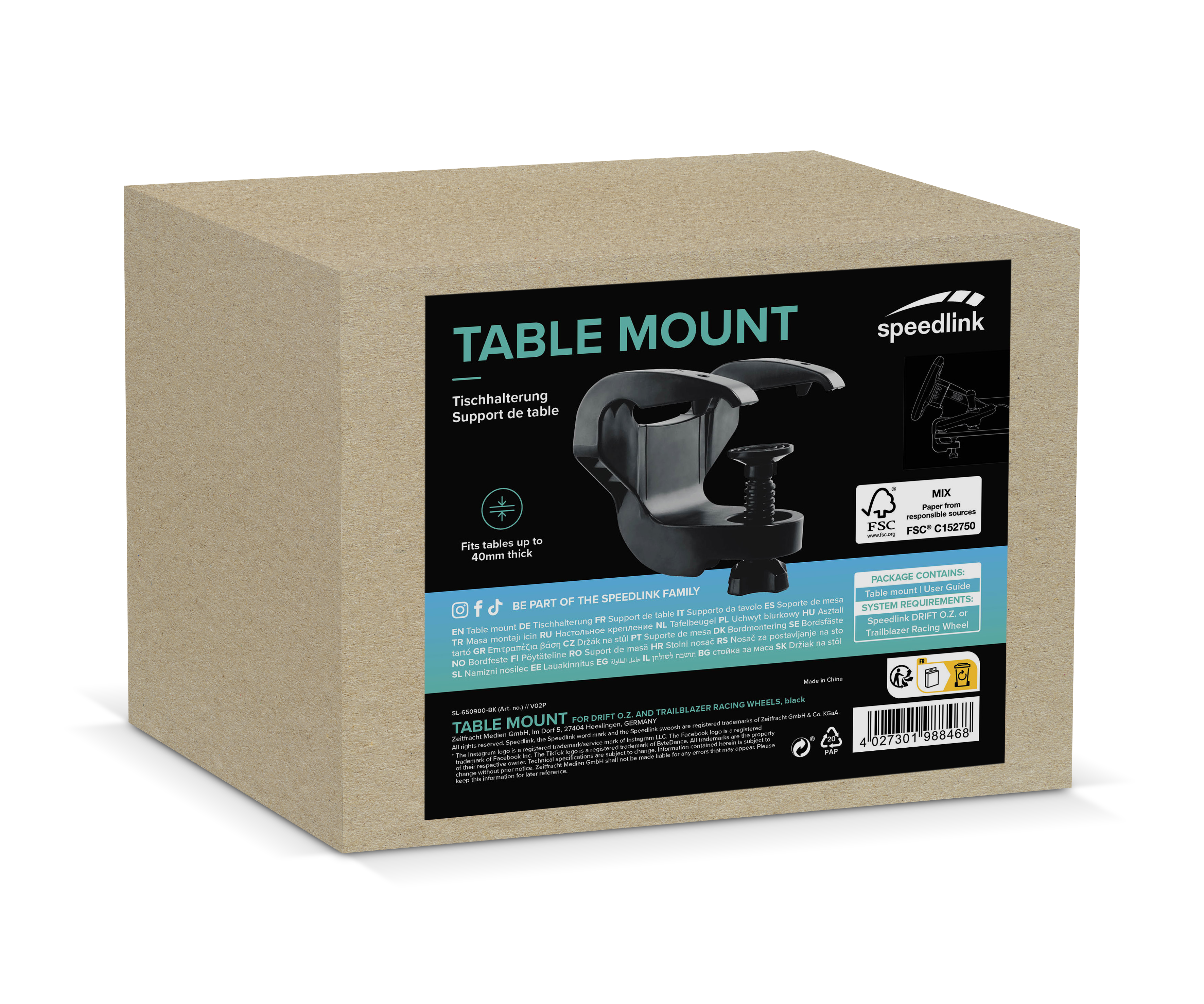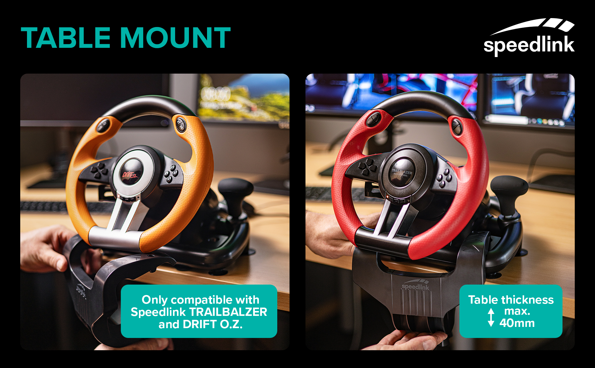 Alles im Griff – mit dem TABLE MOUNT für DRIFT O.Z. und TRAILBLAZER Racing Wheels maximierst du deinen Gaming-Spaß im Handumdrehen. Dank der unkomplizierten Handschraube kann dein Lenkrad kinderleicht an Tischplatten mit einer Stärke von bis zu 40 Millimetern montiert und befestigt werden. Somit ist auf kurvigen Rennstrecken und in aufregenden Momenten größtmöglicher Halt jederzeit garantiert. Die Tischhalterung ist mit dem Speedlink DRIFT O.Z. Racing Wheel für PC sowie mit dem TRAILBLAZER Racing Wheel für PC, PS4®, PS3®, Xbox® und Nintendo Switch® kompatibel. Mit dem TABLE MOUNT driftest du gekonnt um jede noch so enge Kurve!