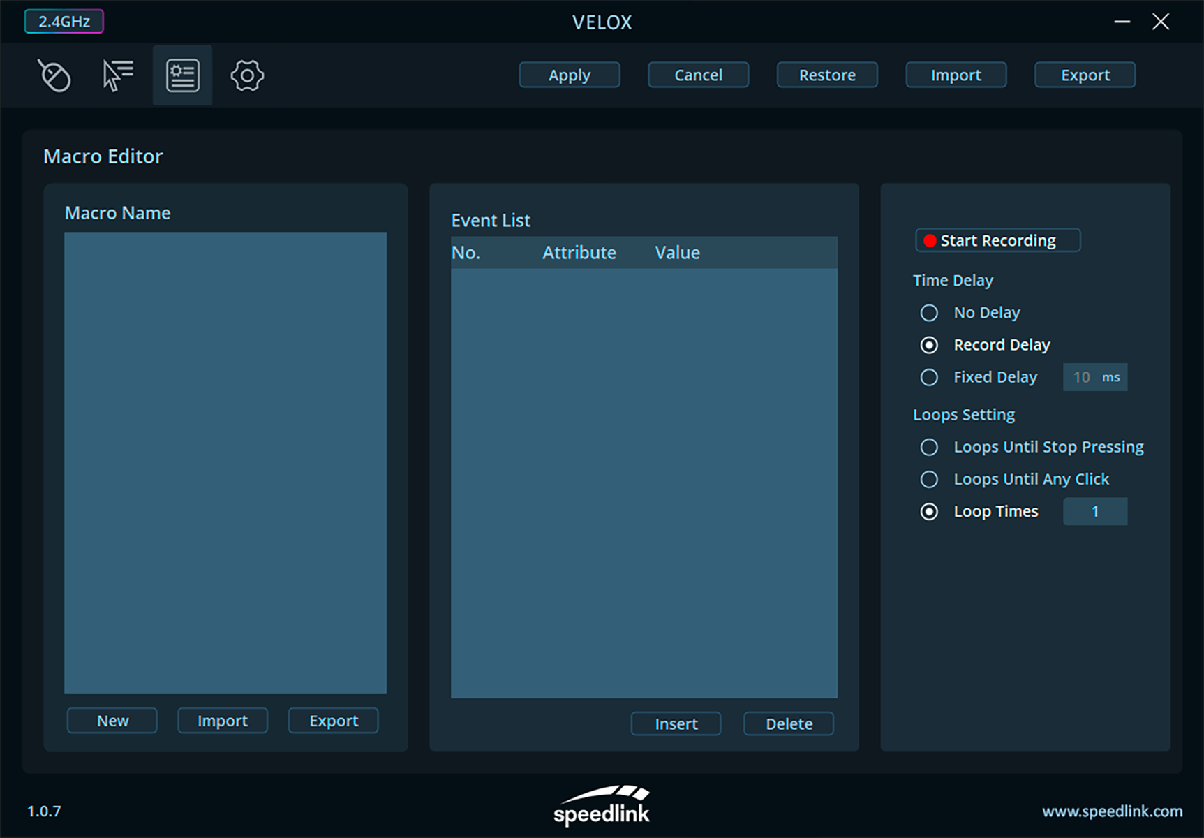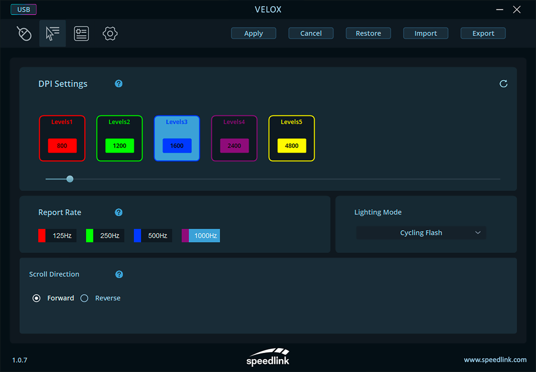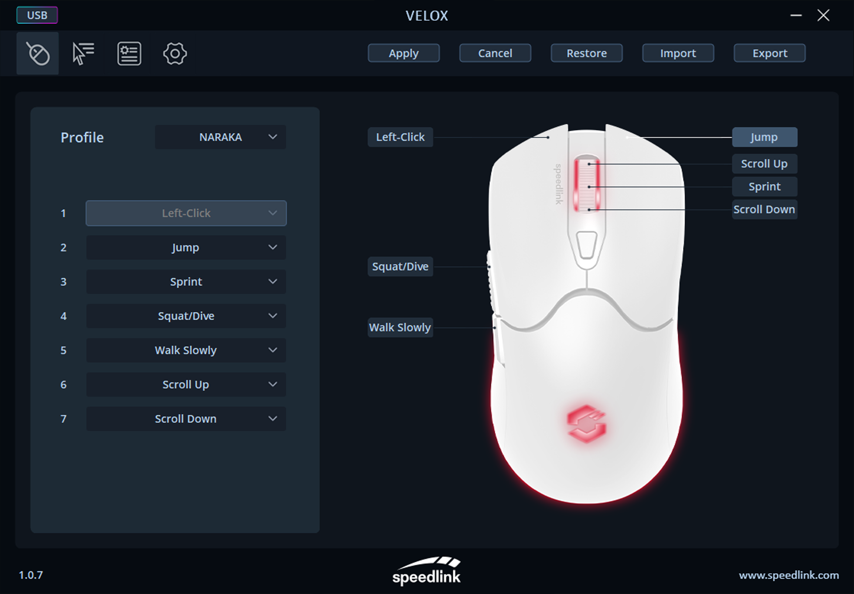 Die wiederaufladbare, kabellose VELOX Gaming-Maus von Speedlink katapultiert das Gameplay auf ein neues Level und gewährt grenzenlose Freiheit. Mit dem präzisen, einstellbaren Pixart Sensor PAW3212 mit bis zu 4.800 dpi und einem leistungsstarken 400-mAh-Lithium-Ionen-Akku sind lange, unterbrechungsfreie Gaming-Sessions garantiert. Die Maus punktet mit einer maximalen Polling-Rate von 1.000 Hz und einer Trackinggeschwindigkeit von bis zu 30 ips. Dank der einfachen Installation ist die Maus sofort einsatzbereit – perfekt für sofortigen Gaming-Spaß. Die dezente Beleuchtung am Boden der Maus und das beleuchtete Logo auf der Rückseite setzen Akzente im Setup. Die Konfigurations-Software ermöglicht das Definieren von Makros, sowie das Anpassen von Tastenbelegungen, verschiedener Beleuchtungsmodi und das Speichern verschiedener Profile, um die Spielstrategie zu perfektionieren.