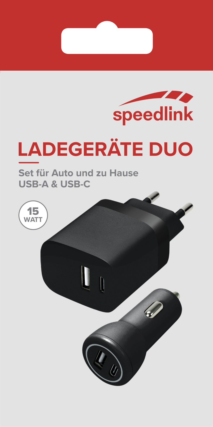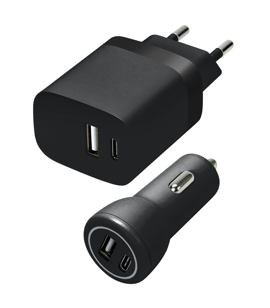 Wand- & Autoladegerät-Set USB-A & USB-C 15W, schwarz