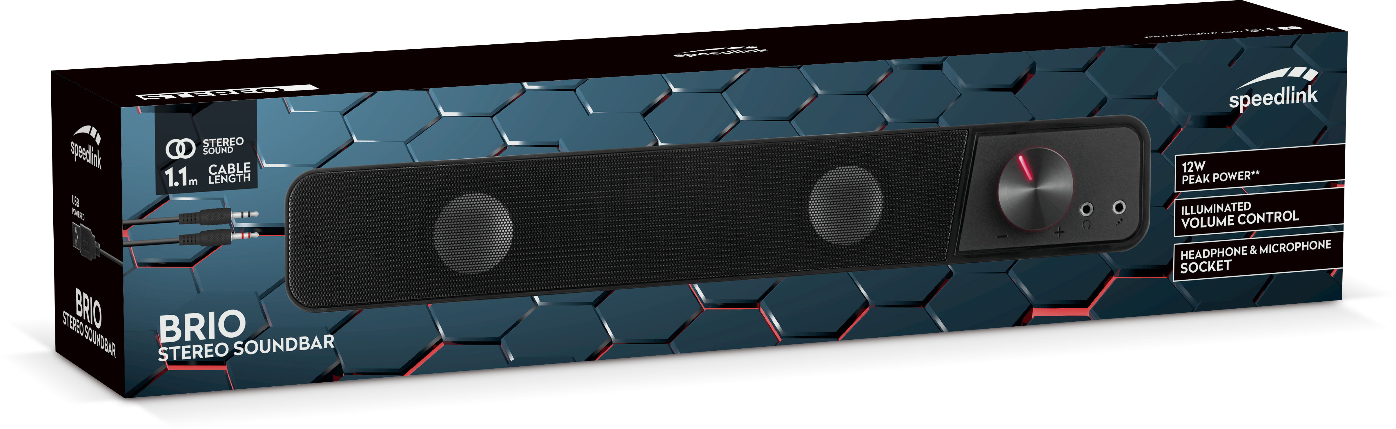 Excellent acoustics and a modern design - the BRIO Stereo Soundbar sets the tone in every respect. With a peak power of 12 watts, the powerful sound system fills every room with excellent audio quality. Thanks to the compact dimensions and the clever arrangement of the two loudspeakers, the BRIO can easily be placed under the computer screen. This design feature saves space and creates a sleek, uncluttered workspace. The easy-to-use volume control highlighted with lighting completes the design. The headphones and microphone can be connected directly to the front of the soundbar if required. So annoying cable replugging on the computer is a thing of the past.