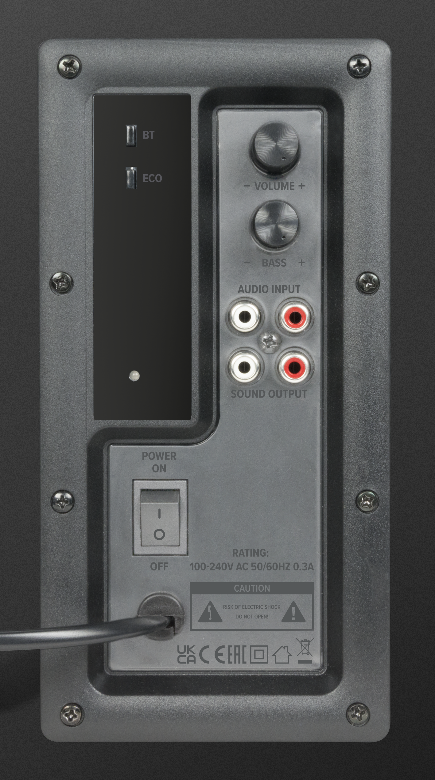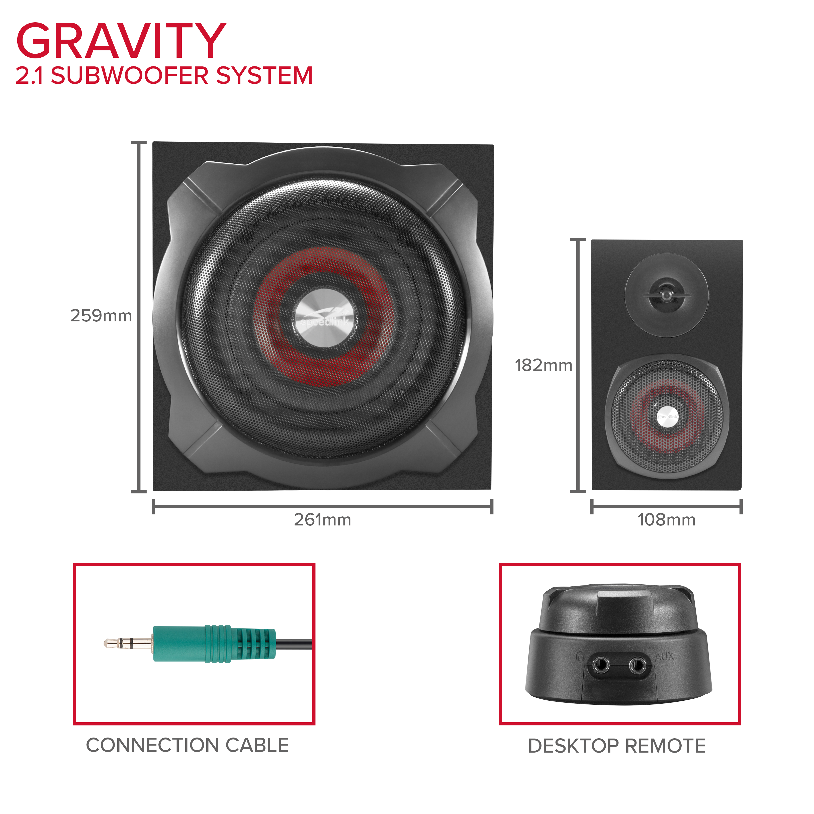 The GRAVITY is an active 2.1 sound system for PC or notebook use. You can hook it up to a multimedia device, smartphone or tablet using an AUX cable or via Bluetooth®. Be prepared to have your world rocked thanks to the powerful subwoofer which delivers deep bass and high-volume sound. A practical desktop remote makes it a breeze to control the speaker system, and thanks to its mains switch and auto stand-by mode the GRAVITY wastes zero power. It’s a true all-rounder for any situation.