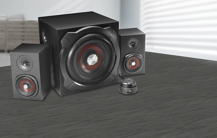 The GRAVITY CARBON is an active 2.1 sound system for PC or notebook use and features a stunning carbon design for a distinctive look. You can hook it up to a multimedia device, smartphone or tablet using an AUX cable or via Bluetooth®. Be prepared to have your world rocked thanks to the powerful subwoofer which delivers deep bass and high-volume sound. A practical desktop remote makes it a breeze to control the speaker system, and thanks to its mains switch and auto stand-by mode the GRAVITY CARBON wastes zero power. It’s a true all-rounder for any situation.
