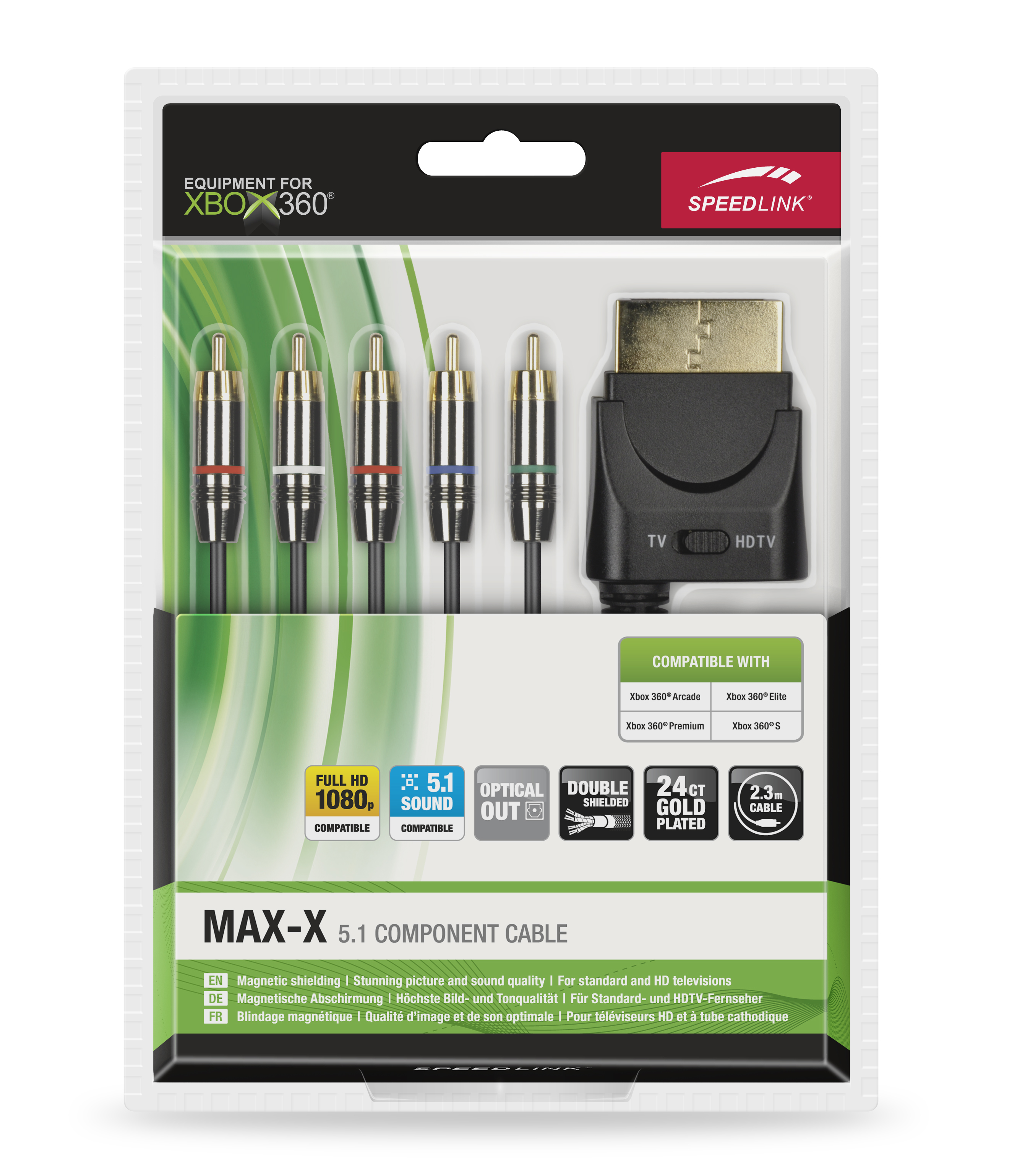 Enjoy Xbox 360® games in stunning picture and sound quality – whether on your standard or flatscreen TV. The extra-long component cable also transmits pin-sharp HD pictures at resolutions up to 1080p to any Full HD device, plus the cable’s magnetic shielding effectively eliminates noise. It also features high-quality full-metal phono connectors for optimal signal quality and maximum durability.