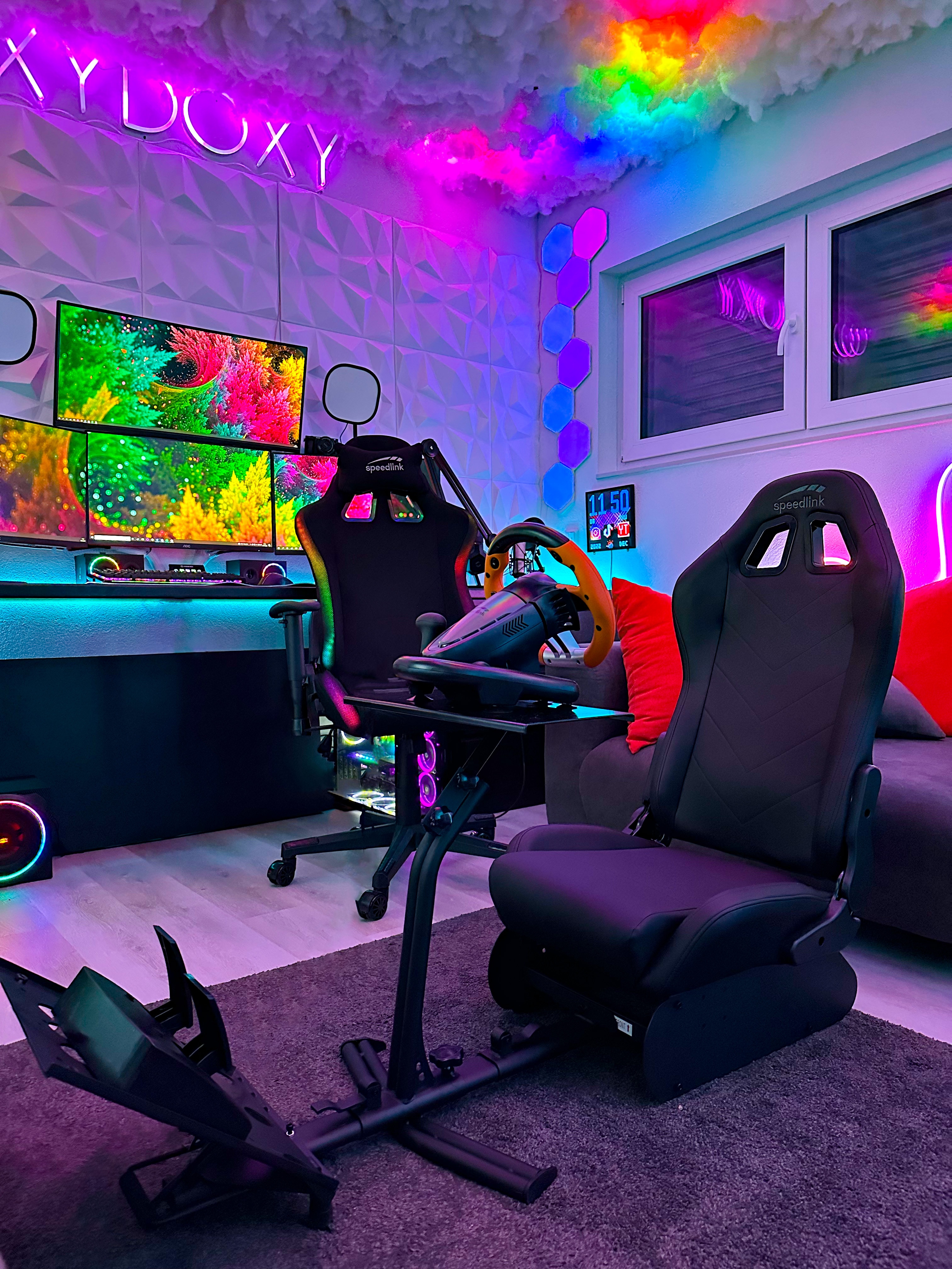 The PAYZE Racing Simulator Cockpit provides a breathtakingly authentic racing experience behind the wheel of your choice. Experience chases as intense as in a real car in the fast lane while also enjoying maximum seating comfort. The solid metal frame of the cockpit can be individually adjusted to your height and has an extremely comfortable and durable PU leather seat. Both the backrest and the brackets for the foot pedals and steering wheel can be optimally aligned depending on the seating position. The PAYZE Racing Simulator Cockpit makes your time behind the wheel an absolute pleasure, helping your achieve constant top performances on the race track. Get in and leave the competition behind.