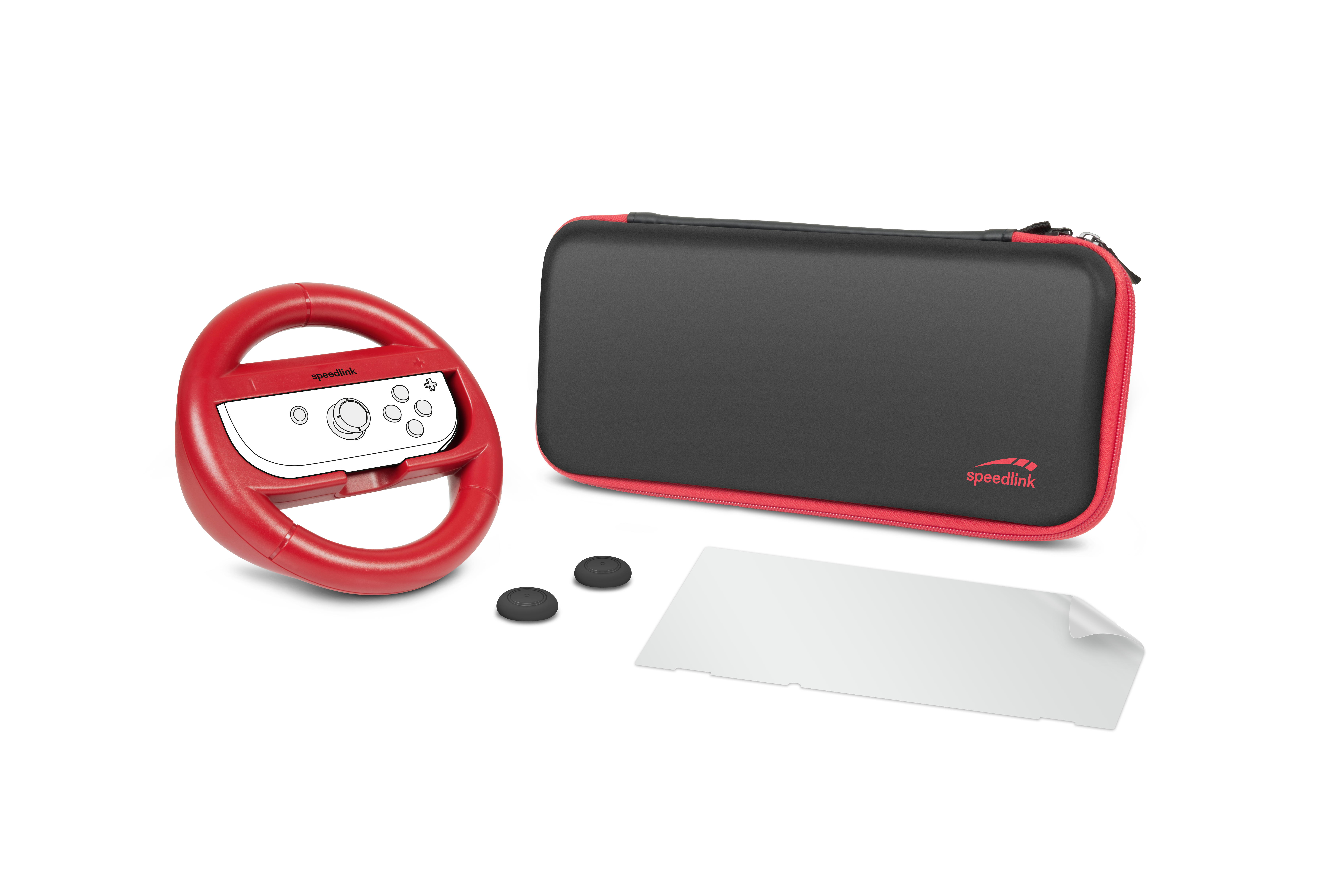 Corner and drift like a pro with the Racing Starter Kit for the Nintendo Switch®. The ergonomic racing wheels, which the Joy-Cons® simply clip into, provide extra grip, while the screen protector saves your Nintendo Switch® screen from getting scratched and damaged. Personalise your console in a range of colours with the Joy-Con® caps – choose black for added grip for maximum control on the virtual race track. And with the padded carry box, your Nintendo Switch® has all the protection it needs when on the move.
