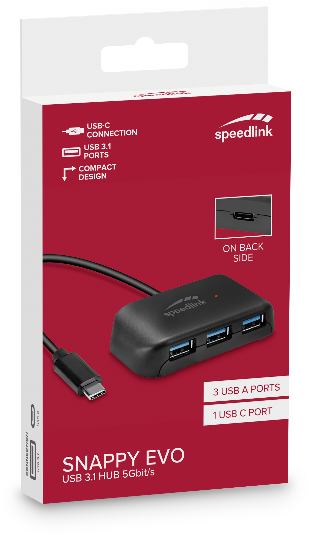 Easily turn one USB-C interface into 4 practical USB interfaces (3 x USB-A and 1 x USB-C). The SNAPPY EVO USB-C to USB 3.1 hub ensures super-fast data transfer of up to 5 Gbit/s and, for example, lets you connect and use external storage media immediately thanks to the simple plug & play installation. Its compact design fits modern hardware and takes up little space, making it easy to transport.